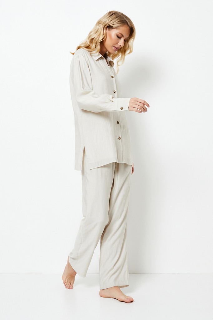 Комплект Amara легко сочетает в себе стиль и комфорт, создавая уютный образ, который идеально подойдет для любого повседневного случая, от ленивого дня дома до стильной прогулки по пляжу. Рубашка выпо... Показать описаниелнена в классическом стиле, отличается изысканными манжетами на пуговицах и шикарными разрезами по бокам, что делает ее идеальным как для отдыха в помещении, так и на пляже. Брюки имеют пояс с регулируемыми завязками, дополнены металлическими украшениями, практичные карманы обеспечут стиль и комфорт.