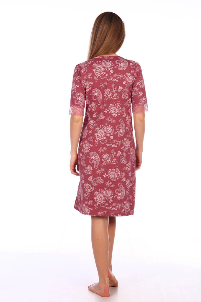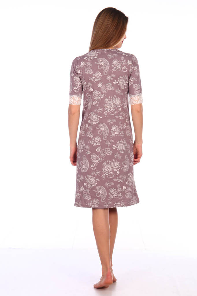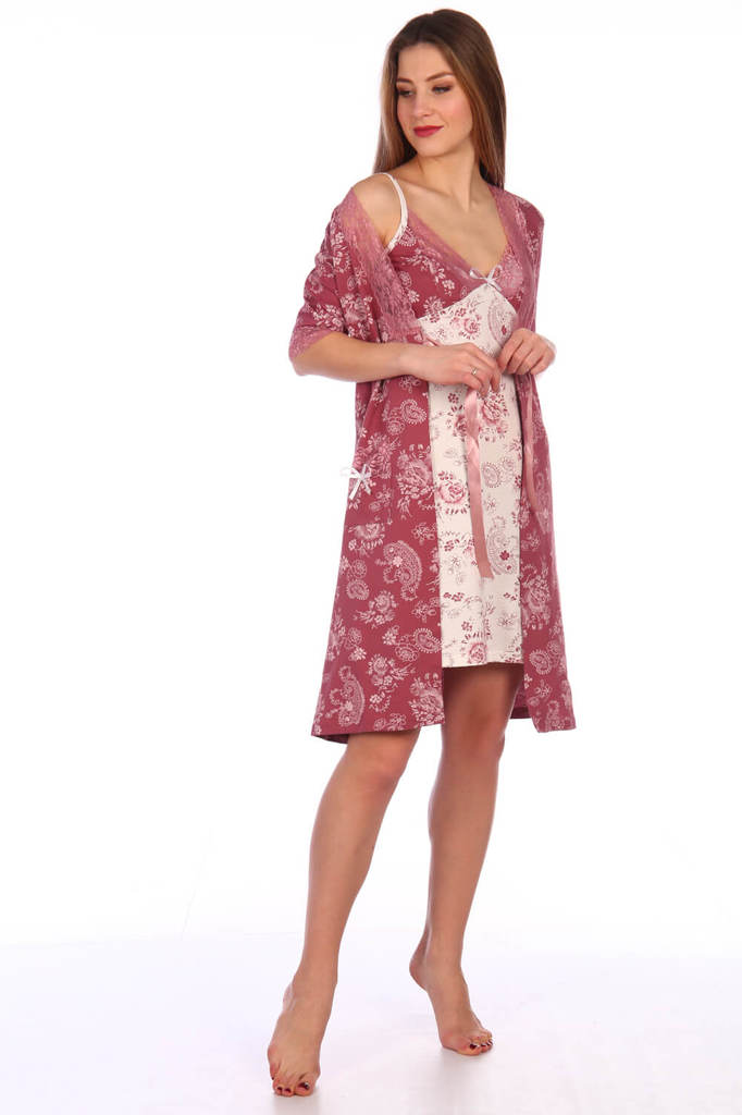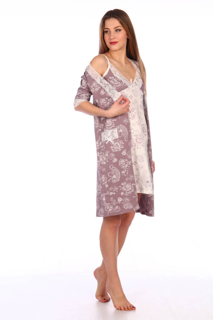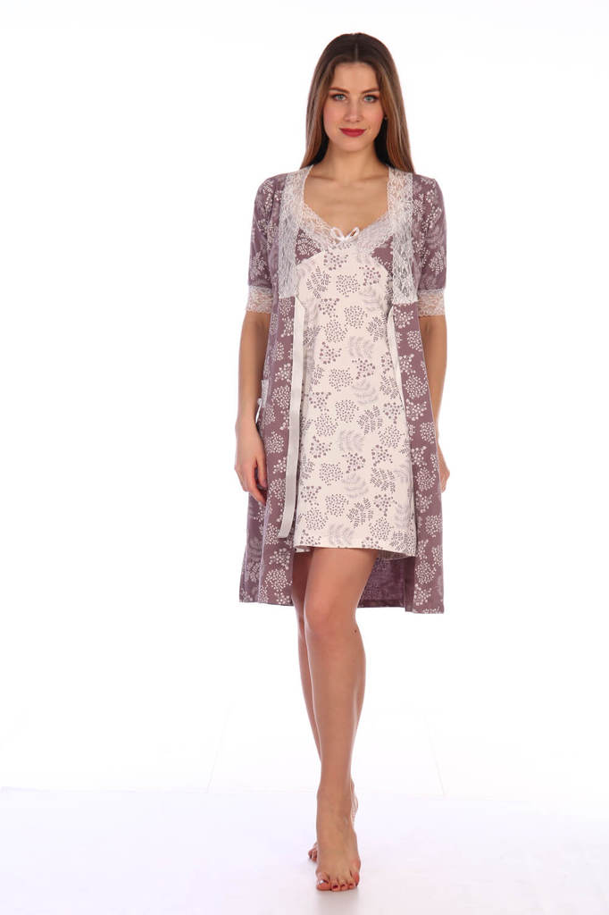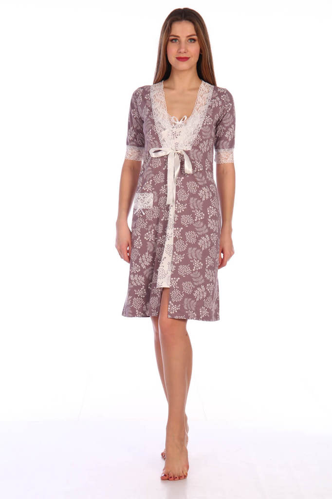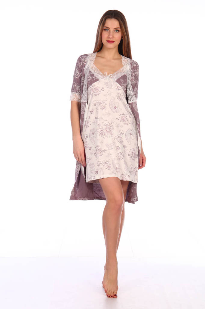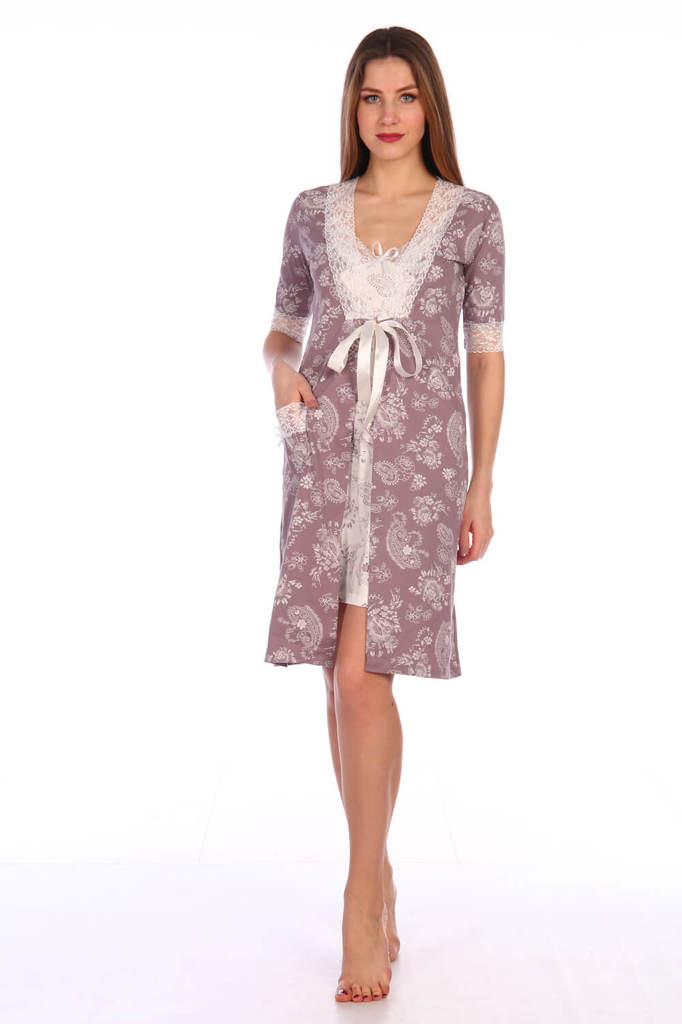 Элегантный женский трикотажный комплект (пеньюар и сорочка) с кружевом-стрейч. Ткань - трикотаж (кулирка). Состав ткани хлопок 100%. Размерный ряд 42-60