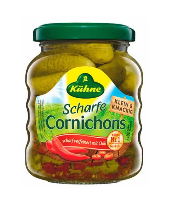 Корнишоны маринованные пикантные Kuhne – это продукт высшего качества, выращенный и произведенный в Германии по особому рецепту. В процессе производства используются тщательно отобранные натуральные с... Показать описаниепеции и пряности, а также высококачественный уксус. Благодаря особо бережной технике переработки, огурцы сохраняют свою сочность, яркий аромат и пикантный, слегка сладковатый вкус. Хрустящие маринованные корнишоны содержат множество полезных витаминов, способствуют укреплению иммунитета и улучшению обмена веществ. Корнишоны пикантные Kuhne прекрасно подходят для приготовления салатов или могут служить самостоятельной закуской на вашем столе. Энергетическая ценность в 100 г - 65 ккал. Жиры - 0,2 г, углеводы - 13 г, белки - 1,4 г.