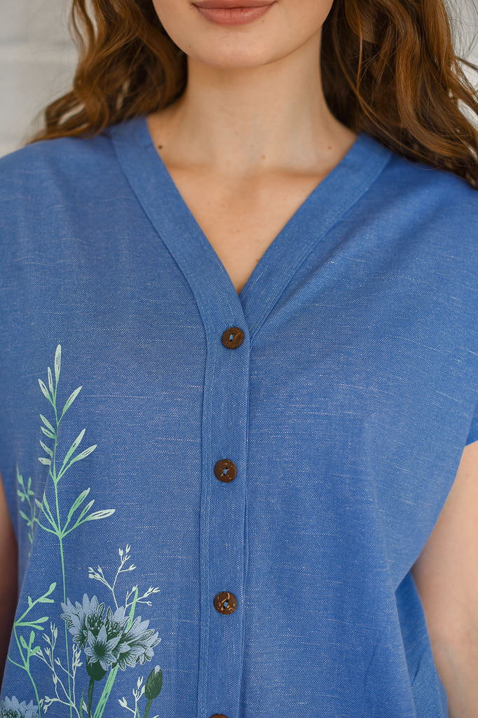 Халат женский из гладкокрашеного полотна свободного силуэта с застежкой на петли и пуговицы. Рукав цельнокроеный короткий. Карманы в боковых швах. По низу изделия оборка. Борта и горловина изделия ока... Показать описаниентованы широкой бейкой из основного полотна. На правой полочке тематический принт. Состав: Хлопок 100% Ткань: Кулирное полотно Цвет: Зеленый, Синий ----------------------------------------: --------------------------