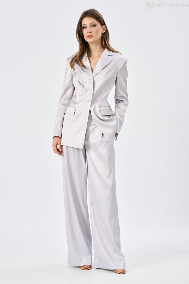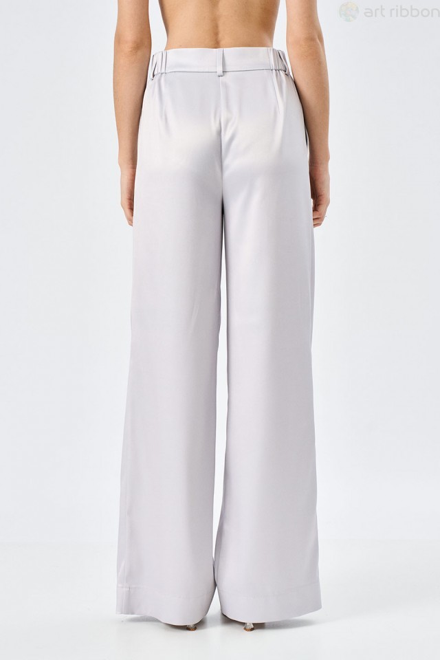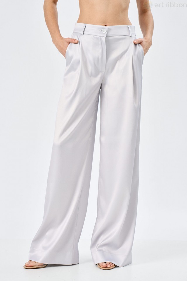 MAGNUS. Возможные размеры: 44-46-48-50-52. Серые атласные брюки-палаццо свободного силуэта с карманами - это не просто одежда, это ощущение свободы и элегантности. Пояс, притачной и идеально сидящий н... Показать описаниеа талии, подчеркивает изгибы фигуры, не сковывая движений. Застежка на центральную тесьму-молнию - классическое и надежное решение, которое обеспечивает комфортное надевание и снятие. Молния скрыта под аккуратной планкой, что придает брюкам завершенный и утонченный вид. Карманы, расположенные по бокам, не только функциональны, но и добавляют изюминку дизайну. Возможно отличие фотографии по оттенку, связанное с разной цветопередачей монитора. Состав ткани:Вискоза: 60%, Полиэстер: 27%, Шелк: 13%. Подробное описание: https://artribbon.ru/m1103b-brjuki-zhenskie.html