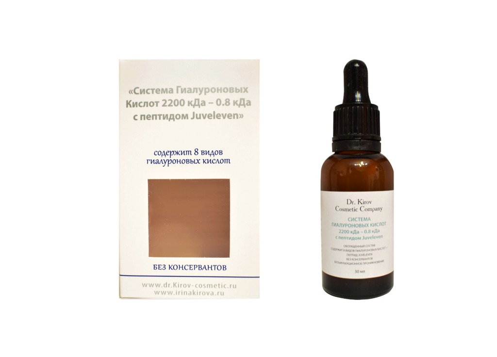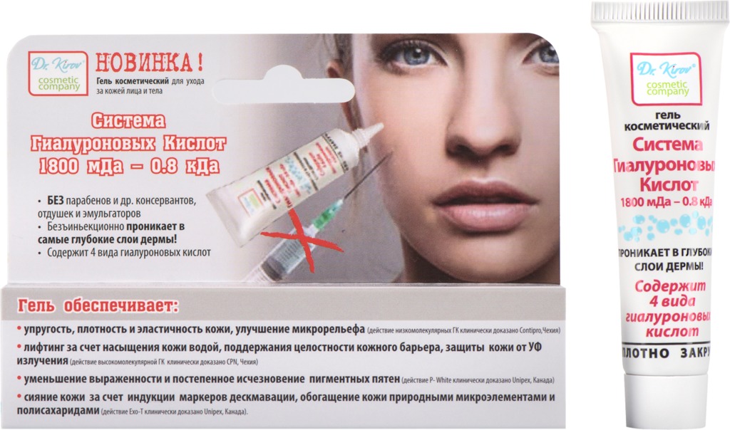 Ссылка на подробное описание Это новый уникальный продукт, не имеющий аналогов на рынке косметики. Не содержит химических консервантов! Содержит 8 (!) видов гиалуроновых кислот с различной молекулярной массой (ГК) проникающих на всю глубину эпидермиса и дермы! Из них 6 видов произведено в Швейцарии ведущим мировым лидером в производстве ГК - PRINCIPIUM S.A. ,и два вида в Чехии – производитель Contipro Group Holding. Гиалуроновый гель содержит: - содержит инновационный пептид Juveleven (Lipotec S.A. (Испания)), эффективно омолаживающий клетки (доказано исследованиями in vitro): фибробласты 55-летнего донора восстанавливали свои свойства, а их морфологические характеристики становились моложе более чем на 10 лет! Juveleven - это ключевой элемент в сохранении жизненного кода. Он участвует в клеточном восстановлении, обновлении и долголетии. Защищает ДНК кожи от повреждений, стимулирует естественное обновление эпидермиса и обращает вспять старение фибробластов. Juveleven поддерживает целостность генома путем защиты ДНК и восстановления ее повреждений, индуцированных различными факторами, а также задерживает старение клеток кожи. - два вида олигомеров гиалуроновых кислот. Это самые мелкие и наиболее ценные и дорогостоящие молекулы гиалуроновых кислот , размером молекул всего 2-10кДа (пр-во Швейцария) и 0.8 - 5 кДа.(пр-во Чехия). Олигомеры ГК проникают в наиболее глубокие слои дермы, недоступные для других видов молекул ГК. - два вида сверхнизкомолекулярных гиалуроновых кислот. Размер молекул: 20—50 кДа (пр-во Швейцария) и 10 – 20 кДа (пр-во Чехия) . Молекулы данных ГК проникнув через поверхностный слой кожи-эпидермис проникают в дерму. - низкомолекулярную ГК (размер молекул 100 - 400 кДа пр-во Швейцария). Молекулы данной ГК проникают в эпидермис и дерму. - среднемолекулярную гиалуроновую кислоту(400-1000кДа пр-во Швейцария) проникает в эпидермис и верхние слои дермы. - два вида высокомолекулярных ГК (100-1800 кДа и 2200-1800кДа , пр-во Швейцария). Такие ГК проникают в верхний слой эпидермиса и создают защитную пленку на поверхности кожи, уменьшающую воздействие на кожу неблагоприятных факторов окружающей среды (УФ-излучения, дегидратации, температурных перепадов).