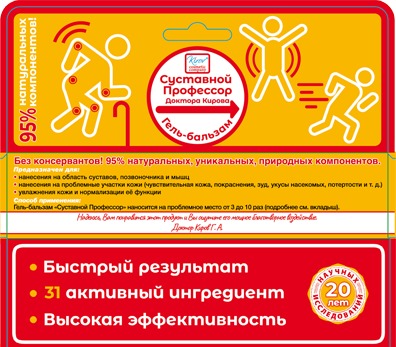 Ссылка на подробное описание Предназначен для: - нанесения на кожу в области суставов, позвоночника и мышц - нанесения на проблемные участки кожи (чувствительная кожа, покраснения, зуд, укусы насекомых, потертости и т.д.) - увлажнения и нормализации функции кожи - можно с успехом использовать для самомассажа. Рекомендуется при проблемах в области суставов, позвоночника и мышц. Благодаря уникальной формуле гель-бальзам оказывает общеукрепляющее и регенерирующее действие на ткани в области нанесения, обеспечивает питательную поддержку и способствует восстановлению функций ткани. 95% ингредиентов, входящих в гель-бальзам «Суставной профессор», имеют растительное и органическое происхождение, играют важную роль в питании, поддержке клеток тканей и их защите. Тщательно сбалансированная формула крема обеспечивает синергичное взаимодействие ингредиентов и взаимное усиление их эффекта. Именно этим обусловлено мощное воздействие геля на ткани и скорейшее достижение результата. Как и вся продукция «Dr. Kirov», гель-бальзам не содержит консервантов, спиртов, силиконов, парафинов, продуктов нефтехимии, катализаторов клеточных реакций, истощающих резервы организма, отдушек. Способы применения: «Суставной Профессор» наносится на проблемное место (участок кожи) от 3 до 10 раз в день. Наносить круговыми движениями 2-3 минуты до полного впитывания, рекомендуется проводить самомассаж. Можно сделать маску-компресс: для этого нанесите гель-бальзам на 3-4 слоя марлевого бинта и приложите к проблемному месту. Сверху необходимо положить компрессионную бумагу, закрепив ещё одним бинтом. Оставьте на 2-3 часа. Внимание! Перед использованием компресса проведите аллерготест. Состав геля–бальзама: - растительная салициловая кислота, экстрагированная из гаультерии лежачей - органическая сера - комплекс хондроитинов и глюкозаминов - гиалуроновая кислота - смесь масел арганы, ши, семян хлопка, кокоса, ореха макадамии, мирры, оливок и корицы - комплекс витаминов Е, С, РР, В5 и В6 - дикалий глицирризинат из корня солодки - эфирные масла мяты перечной и чайного дерева - цитрат серебра - коллоидное серебро - экстракты зеленого чая, ромашки, алоэ, аиры, календулы, каштана конского, подорожника, сабельника, арники.
