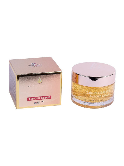 Eyenlip 24K Gold & Peptide Ampoule Cream - антивозрастной крем оказывает интенсивное омолаживающее действие на кожу, повышает ее упругость и эластичность, борется с уже имеющимися морщинами и препятст... Показать описаниевует появлению новых, выравнивает тон лица и осветляет возрастную пигментацию. Глубоко увлажняет кожу и напитывает ее витаминами. Коллоидное золото способствует максимально быстрому и глубокому проникновению веществ в кожу, обеспечивает интенсивный лифтинг, насыщает кожу влагой и кислородом. Пептиды - это вещества органического происхождения. Пептиды способствуют разглаживанию морщин, и противостоят появлению новых, повышают эластичность и упругость кожи, улучшают цвет лица, обладают интенсивным увлажняющим действием. Пептиды восстанавливают контур лица и способствуют регенерации клеток, запуская процессы самовосстановления. Способ применения: Наносить утром и вечером необходимое количество крема на кожу лица и шеи после очищения, тонера, сыворотки и эмульсии.