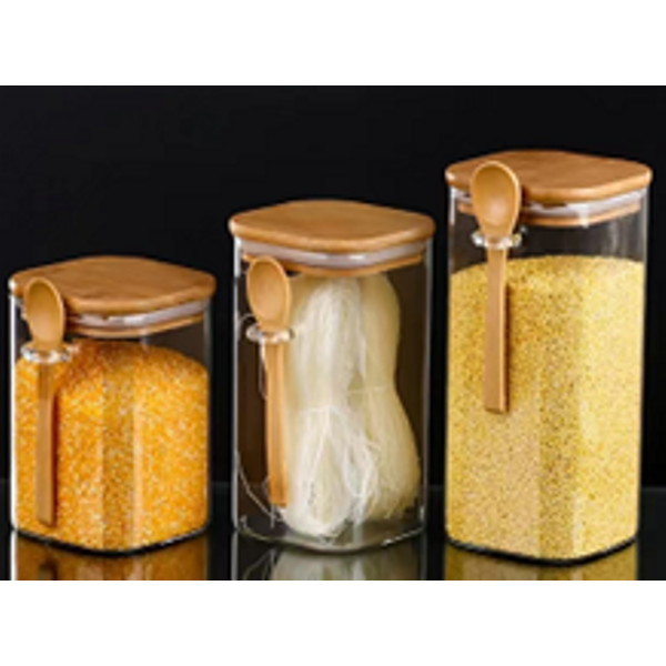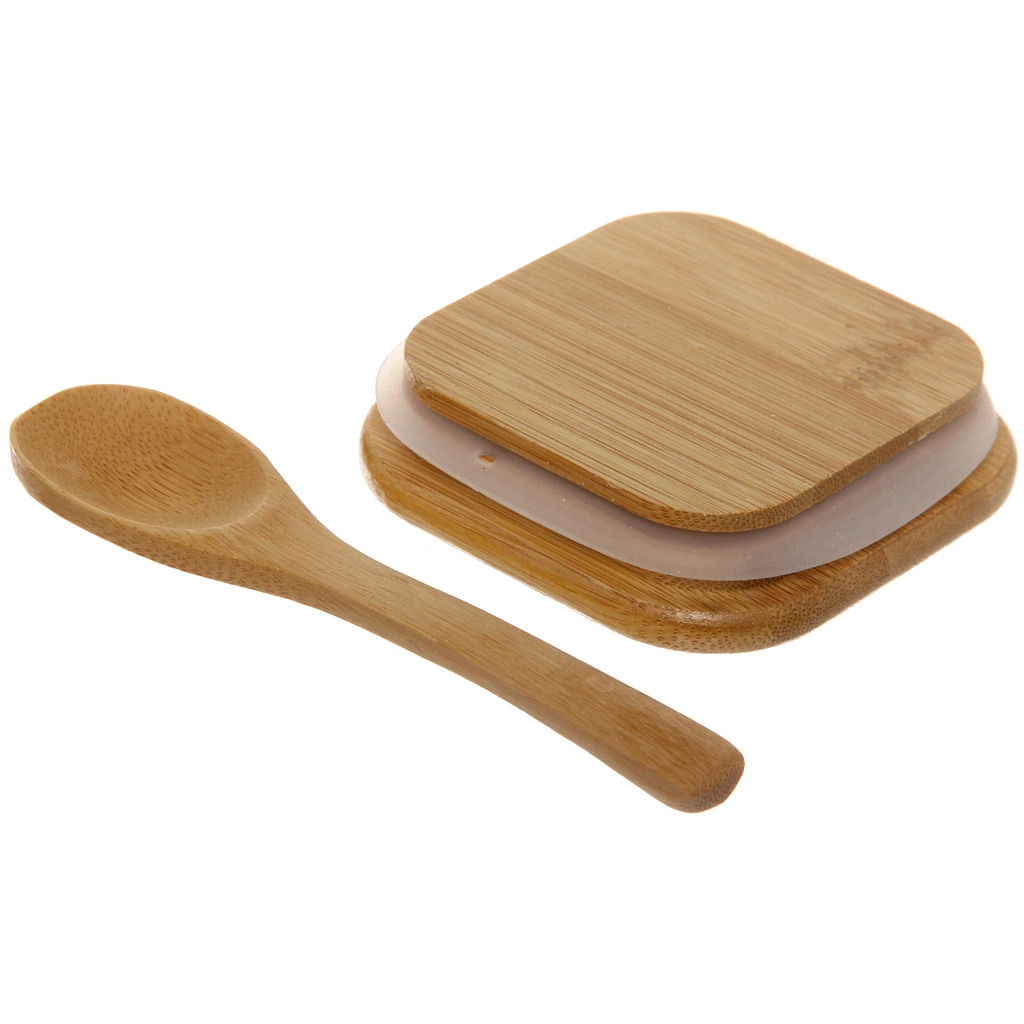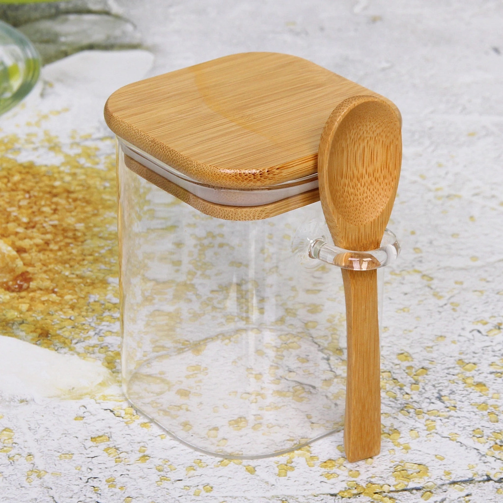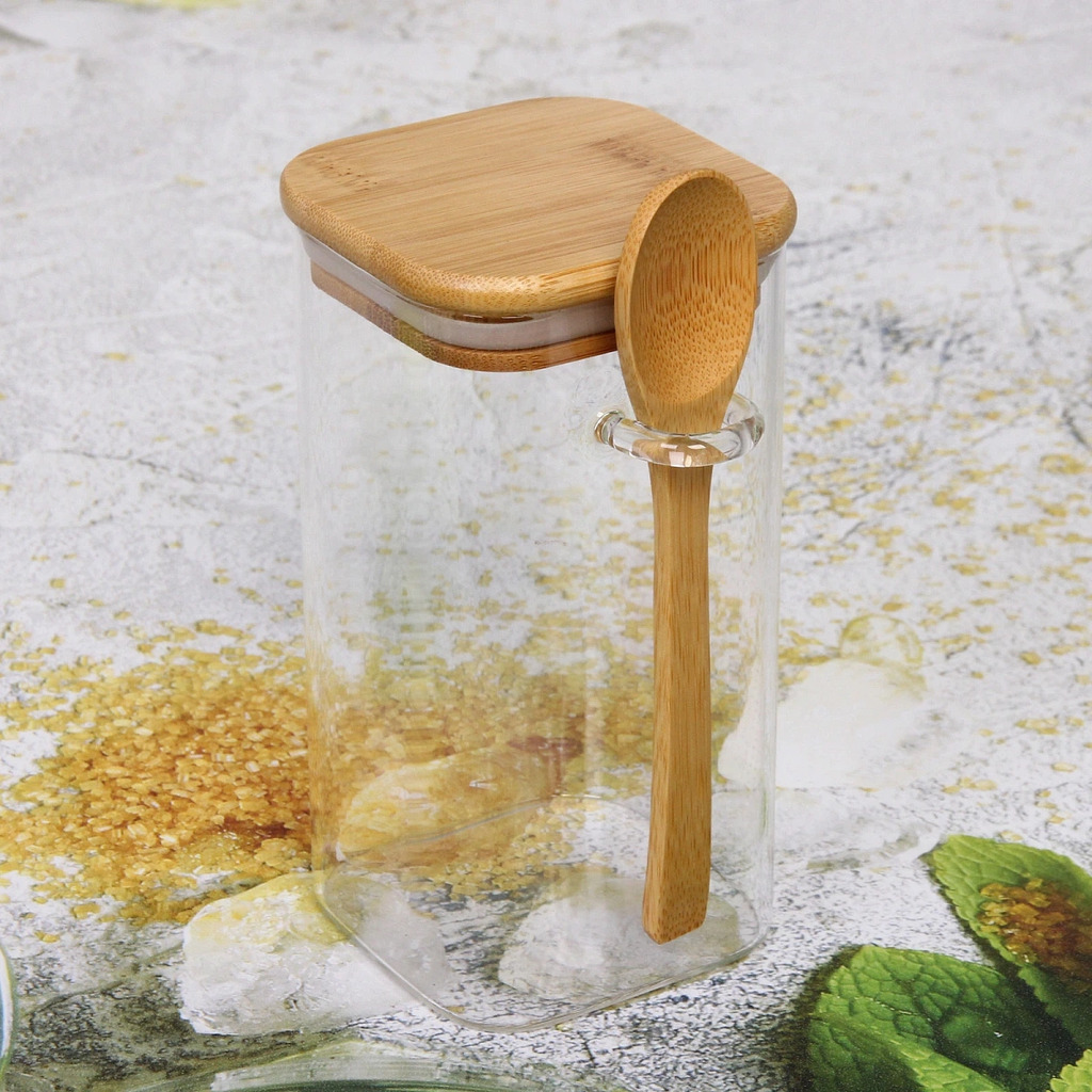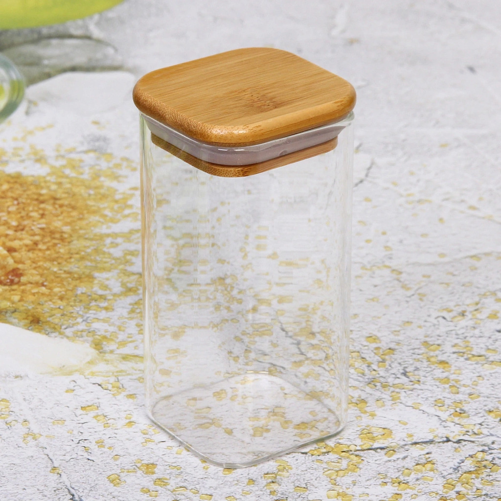 Банка для продуктов стеклянная 700мл "Хай-Тек" с бамбуковой крышкой и ложкой, квадратная 8*15смВопросы по товару