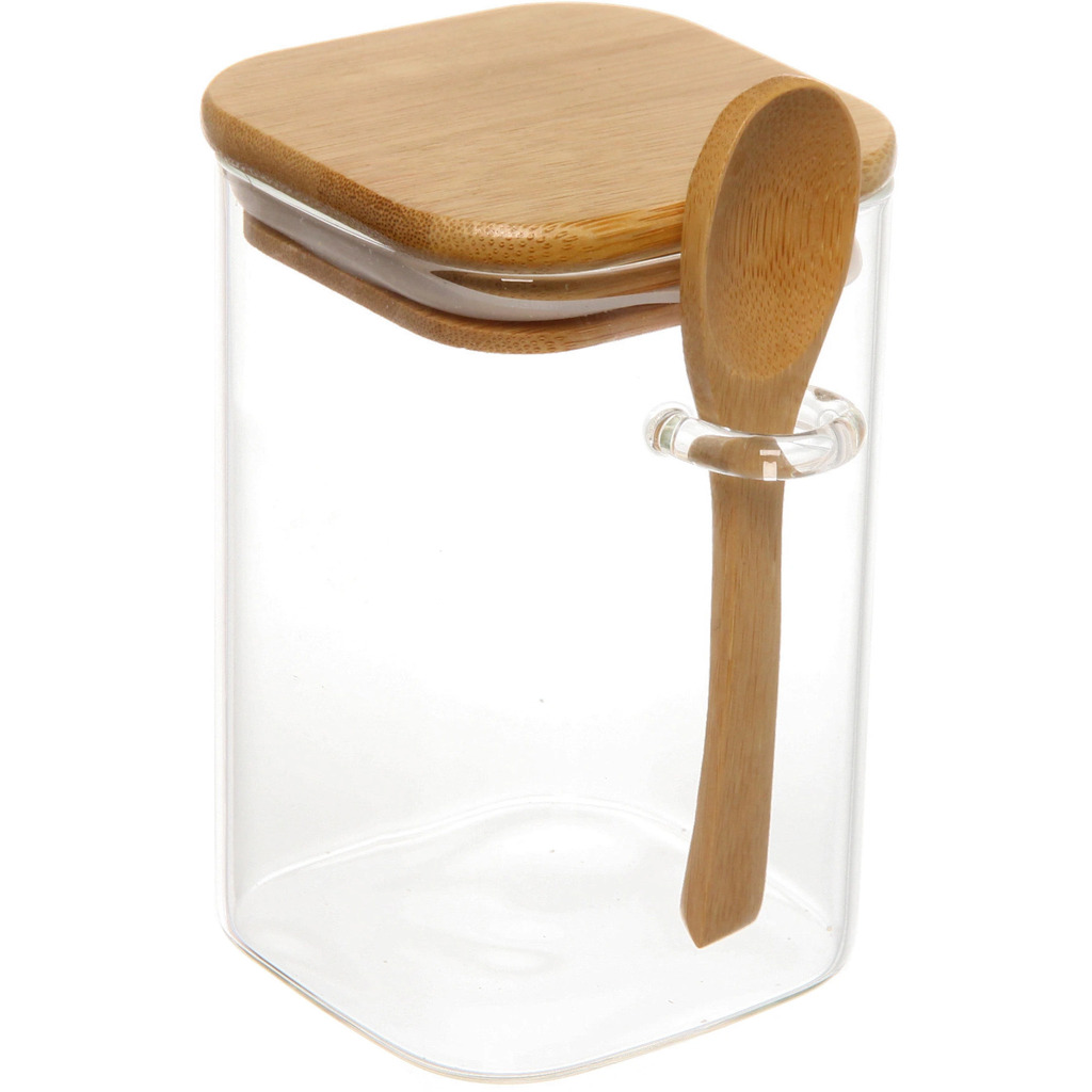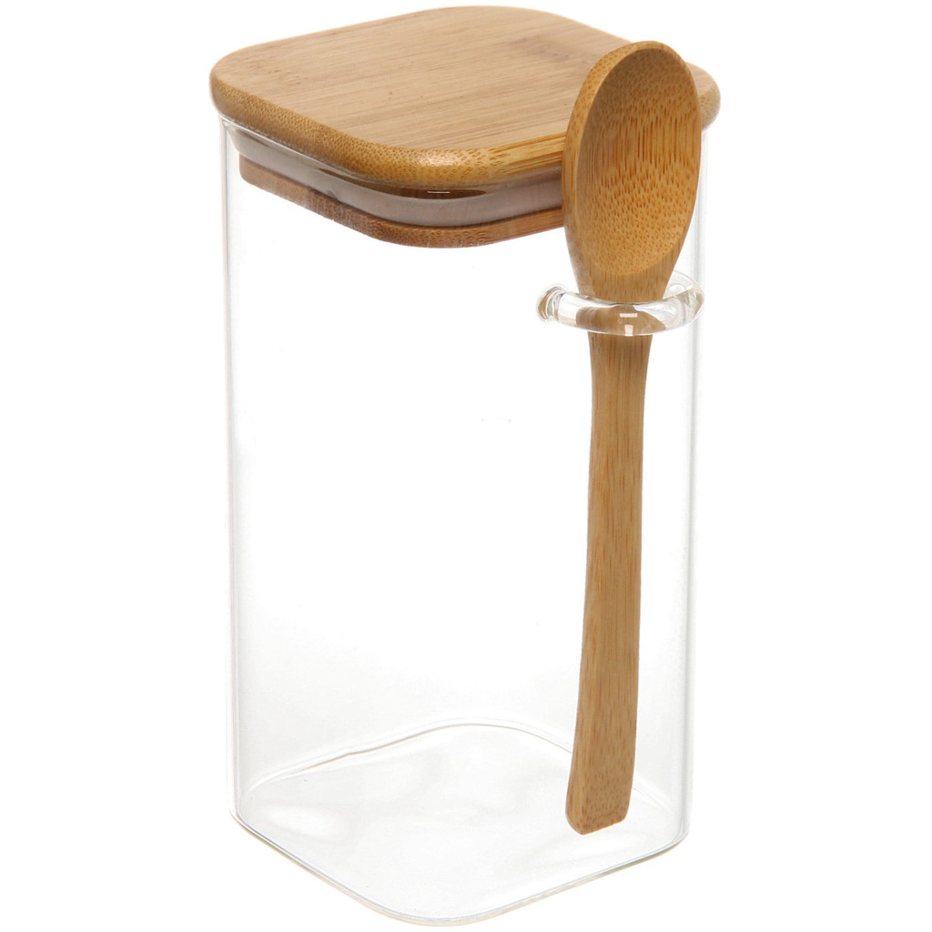 Банка для продуктов стеклянная 850мл "Хай-Тек" с бамбуковой крышкой и ложкой, квадратная 8*20смВопросы по товару