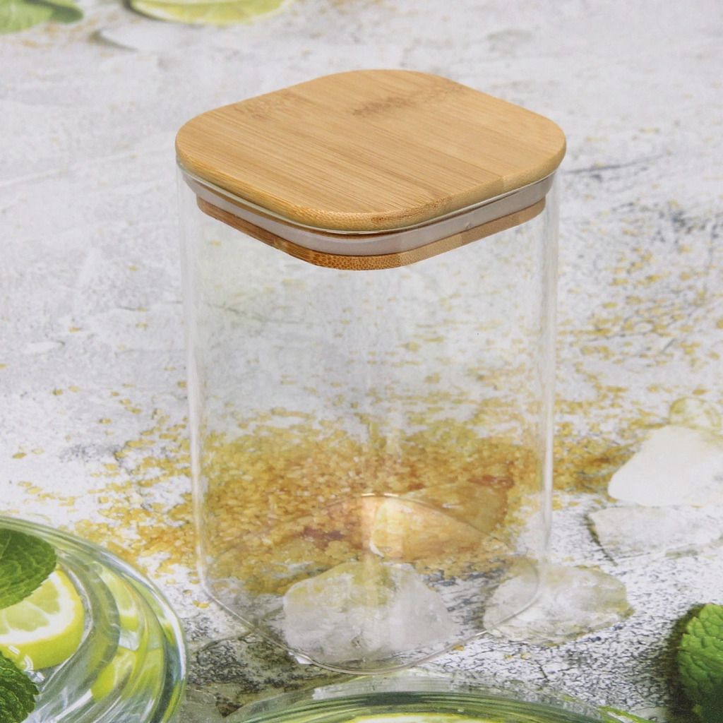 Банка для продуктов стеклянная 400мл "Хай-Тек" с бамбуковой крышкой, квадратная 6*15смВопросы по товару