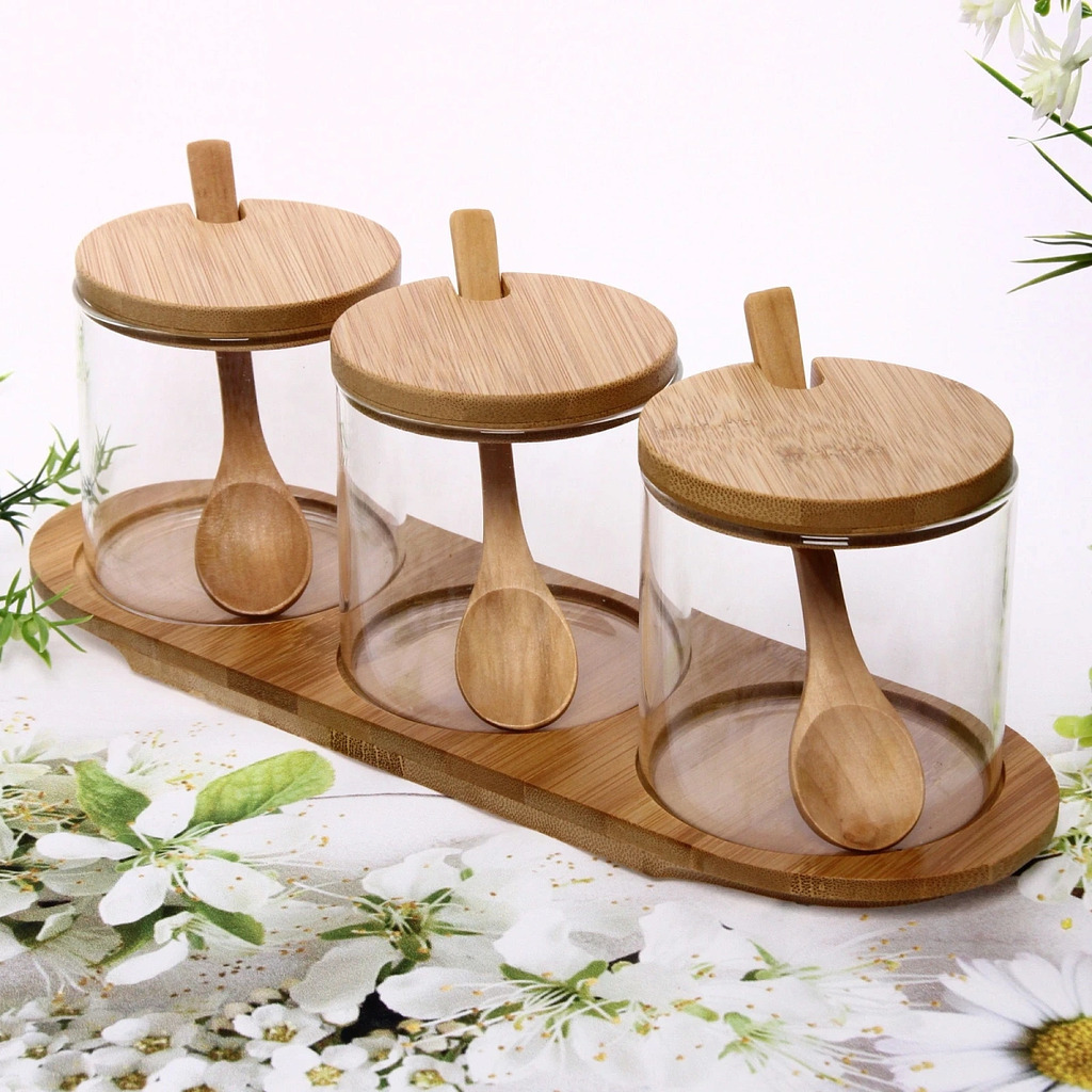 Банка стеклянная для специй 300мл "Хай-Тек" в наборе 3шт на бамбуковой подставкеВопросы по товару