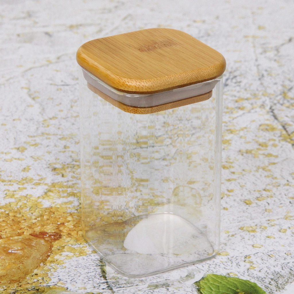Банка для продуктов стеклянная 300мл "Хай-Тек" с бамбуковой крышкой, квадратная 6*12смВопросы по товару