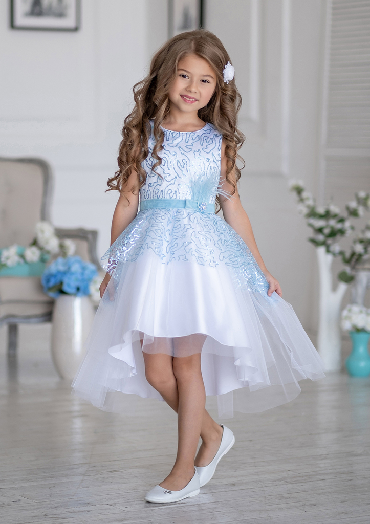 Оригинальное нарядное платье с контрастной пайеточной сеткой. Платье отрезное по линии талии из атласа и отделочной ткани сетки пайетки. Платье с застёжкой на потайную молнию по среднему шву спины. Го... Показать описаниерловина и проймы обработаны атласным кантом в тон сетки пайетки. Лиф платья двухслойный из атласа и верхнего слоя из пайеточной сетки. Юбка ассиметричная по низу (закорочение по переду и удлинение по заднему полотнищу). Юбка состоит из верхней пайеточной баски кроя "солнце", слоя сетки и слоя атласной юбки кроя "полусолнце". Платье на хлопковом подкладе с внутренней юбкой из сетки с 3-мя ярусами воланов. Платье украшает пояс из бархатной ленты с декоративным бархатным бантом с перьями по переду. Пояс сзади завязывается на бант. В центре банта брошь. Производитель оставляет за собой право изменения дизайна отделки, фурнитуры и оттенка ткани без потери для внешнего вида и качества изделий. Состав: верх 100% полиэстер, подклад 100% хлопок