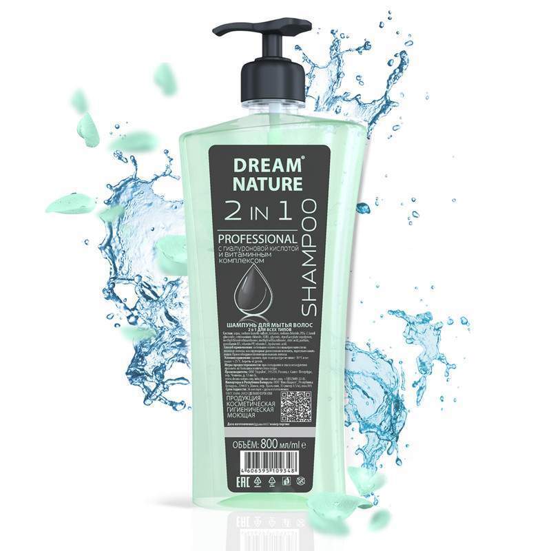Dream Nature Шампунь 2 в 1 с Гиалуроновой кислотой и Витаминным комплексом, бережно очищает, увлажняет, придает блеск и шелковистость, с дозатором 800 мл. Способ применения: Небольшое количество шампу... Показать описаниеня нанести на влажные волосы, массирующими движениями вспенить, тщательно смыть водой. При необходимости повторить процедуру.