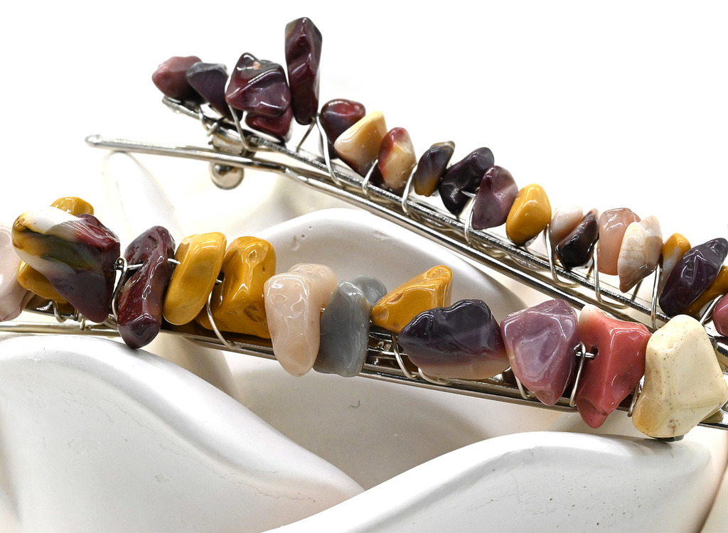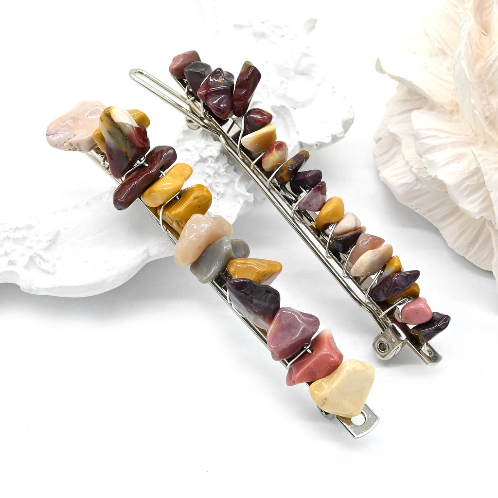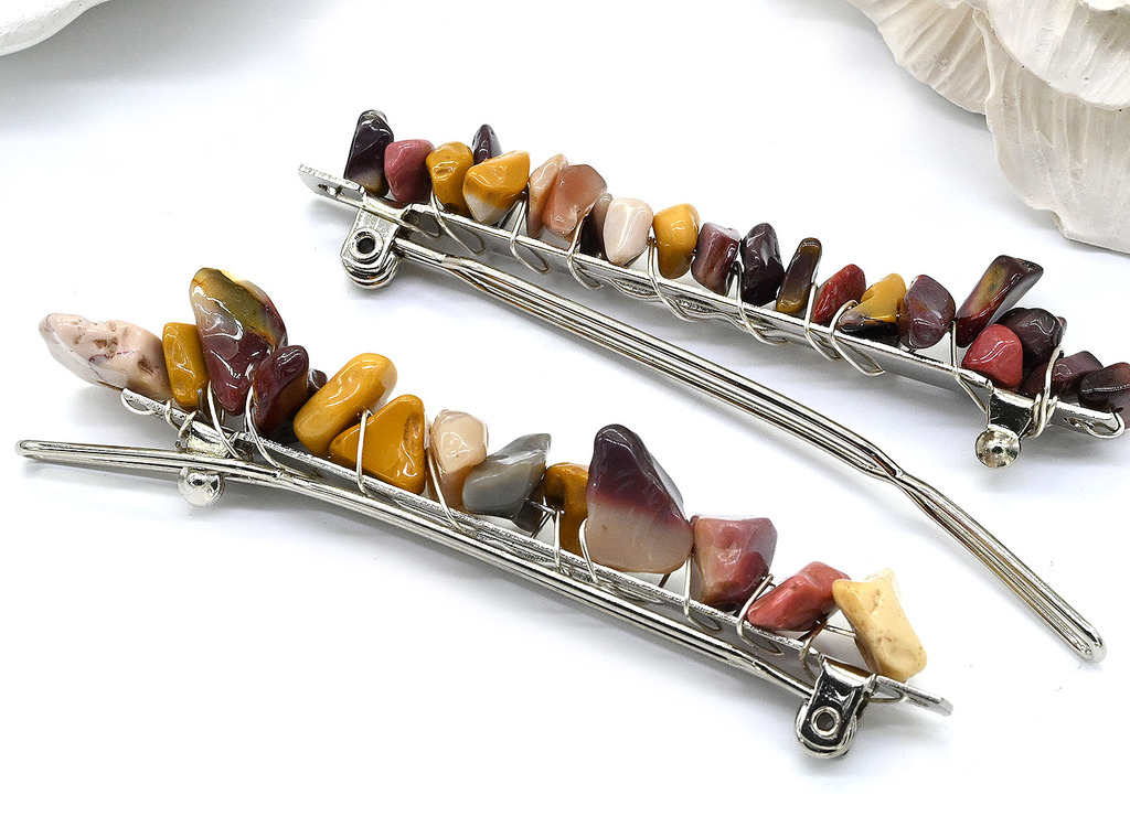 Материал: Яшма мукаит Натуральность: Натуральный камень Месторождение: Австралия •Габариты заколки: длина 6,5см, ширина 0,8см, высота 1,3см. •Габарит заколки ± 2мм. •Цена за 1 шт.