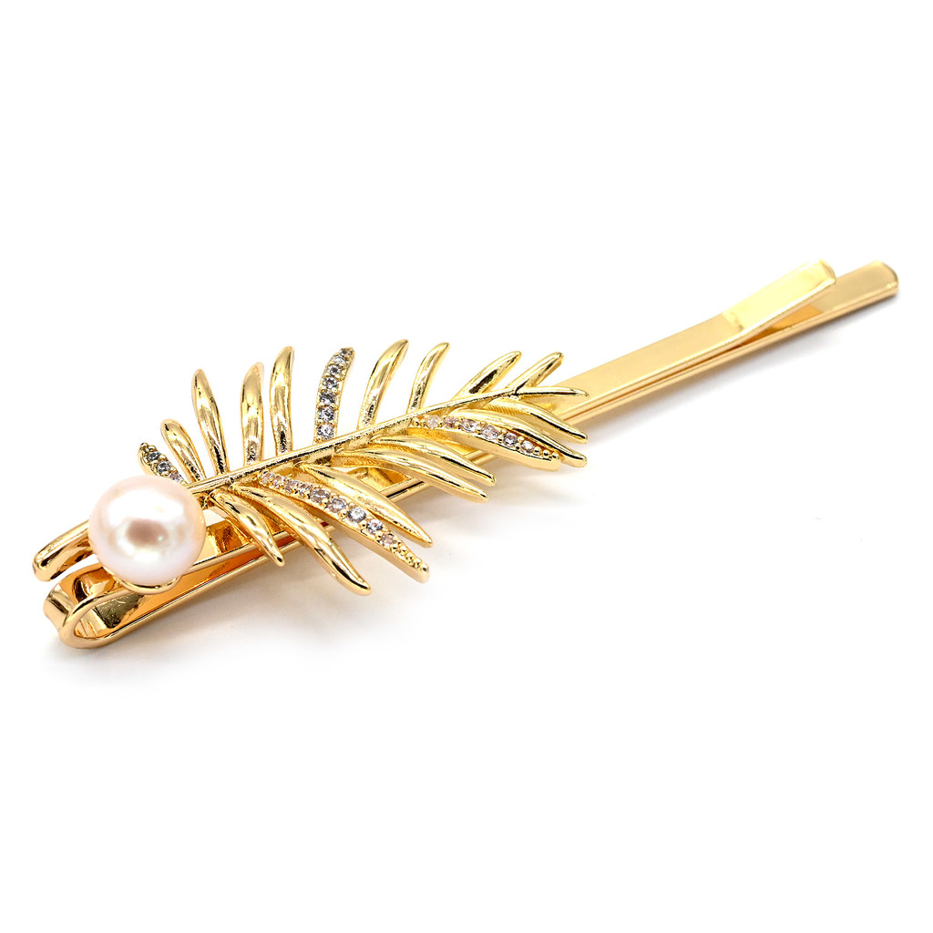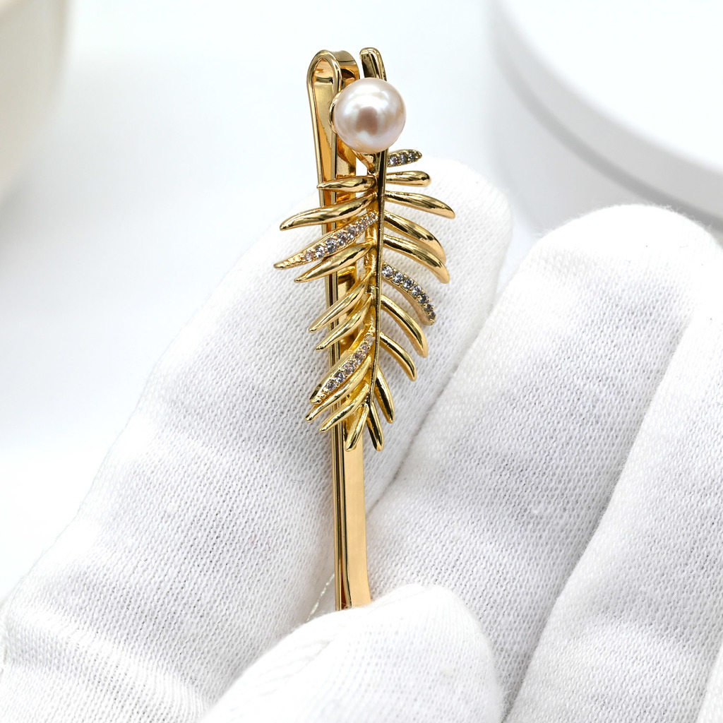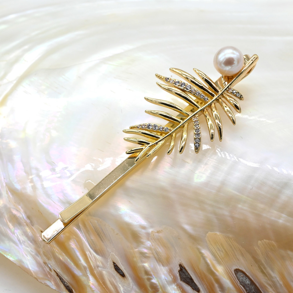 Материал: Жемчуг Натуральность: Натуральный жемчуг Месторождение: Китай •Габариты заколки 20*60мм ± 1мм. •Заколка невидимка для волос цвета золота с жемчугом в форме пальмовой ветви.