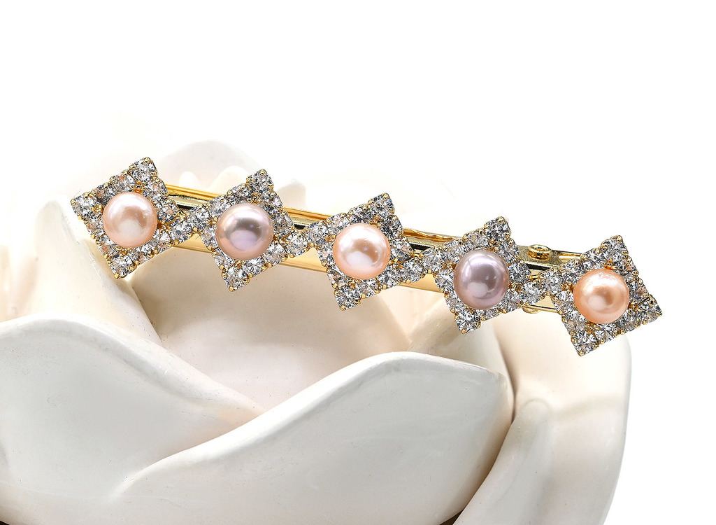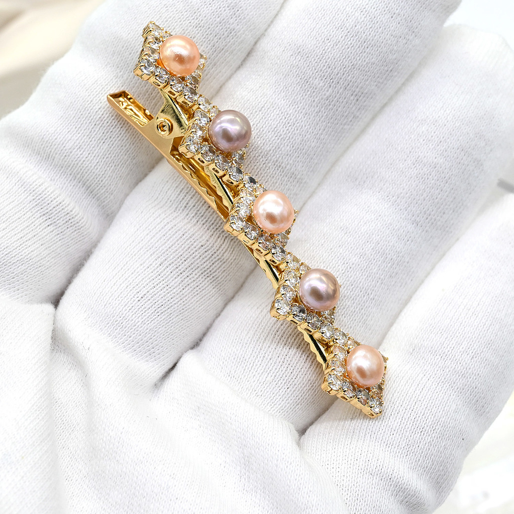 Материал: Жемчуг Натуральность: Натуральный жемчуг Месторождение: Китай •Габариты заколки 14*67мм ± 1мм. •Заколка - зажим для волос цвета золота с жемчугом и цирконами.