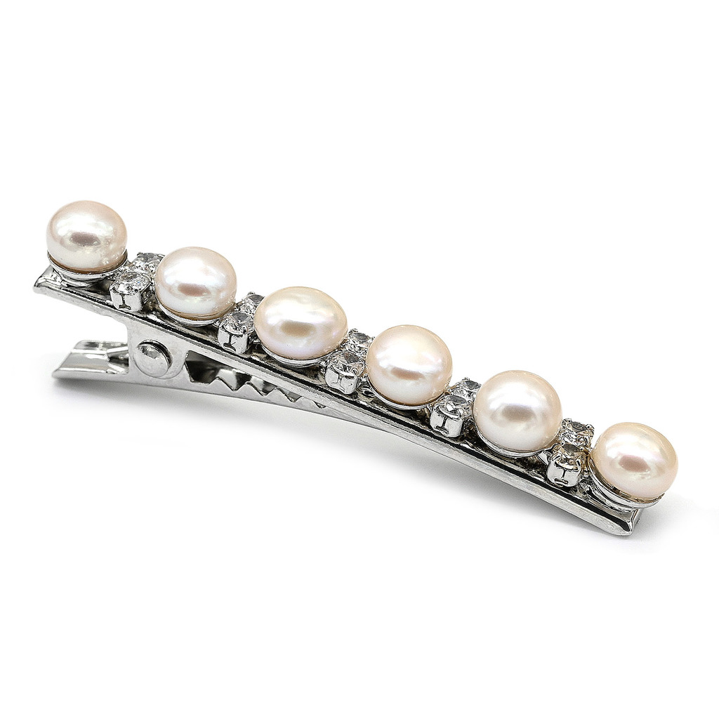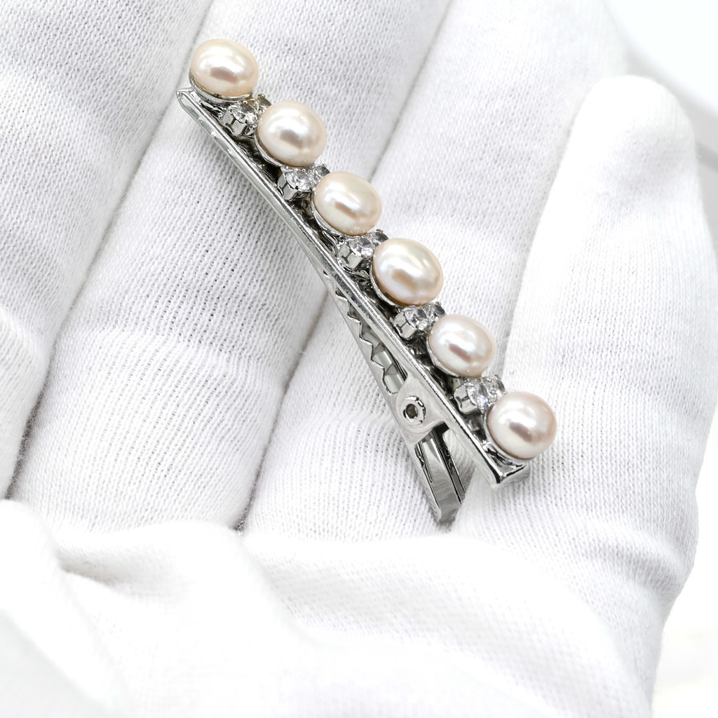 Материал: Жемчуг Натуральность: Натуральный жемчуг Месторождение: Китай •Габариты заколки 6*55мм ± 1мм. •Заколка - зажим для волос цвета серебра с жемчугом и цирконами.