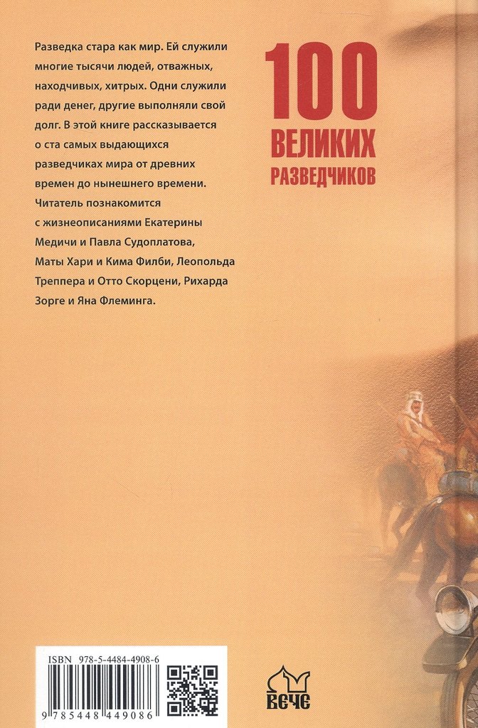 Описание 100  великих разведчиков Все описание Разведка стара как мир. Ей служили многие тысячи людей, отважных, находчивых, хитрых. Одни служили ради денег, другие выполняли свой долг. В этой книге р... Показать описаниеассказывается о ста самых выдающихся разведчиках мира от древних времен до нынешнего времени. Читатель познакомится с жизнеописаниями Екатерины Медичи и Павла Судоплатова, Маты Хари и Кима Филби, Леопольда Треппера и Отто Скорцени, Рихарда Зорге и Яна Флеминга.