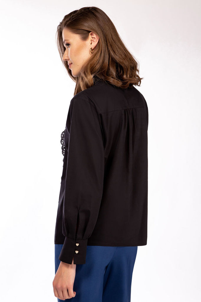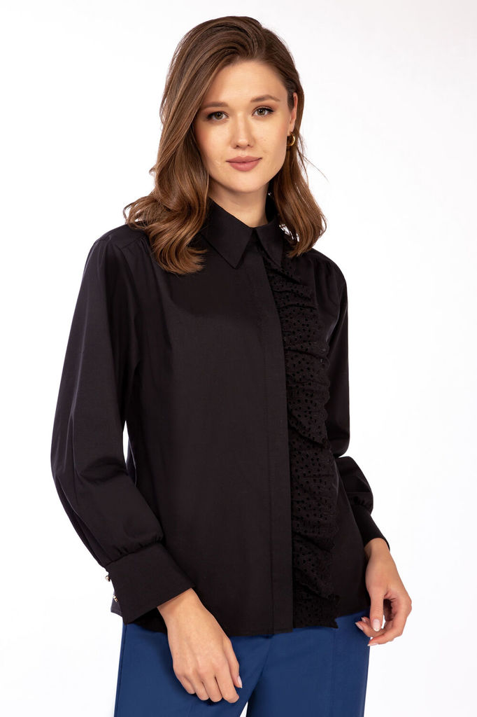 Состав: ПЭ-22%; Хлопок-76%; Эластан-2%; Блузка женская, прямого силуэта, длиной до линии бедер, с втачными рукавами, с втачным воротником, с центральной застежкой («супатная застежка») на 6 петель и 6... Показать описание пуговиц и 1 петлю и пуговицу на стойке воротника. Детали переда блузки с кокетками, по швам соединения – сборка, правая деталь с цельнокроеной планкой, левая деталь с притачной планкой и кружевом. Деталь спинки с кокеткой, по шву соединения по центру - сборка. Рукава втачные одношовные, с притачными манжетами с застежкой на 2 декоративные пуговицы и 2 навесные петли. По швам притачивания манжет закладываются по 2 складки и сборка. Разрезы рукавов обработаны окантовкой. Воротник сорочечный с отрезной стойкой. Углы воротника острые. Блузка: длина спинки – 63см.