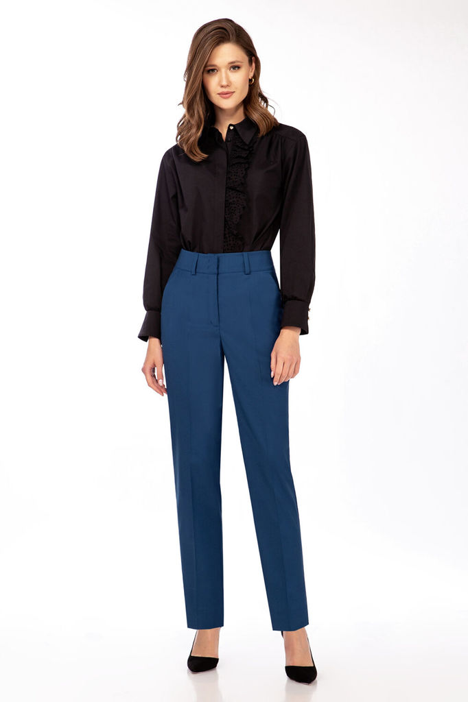Состав: Блуза: Хлопок-100%; Брюки: Вискоза-23%; ПЭ-71%; Спандекс-6%; Комплект женский (блузка и брюки). Блузка хлопковая женская, прямого силуэта, длиной ниже линии бедер, с втачными рукавами, с... Показать описание разрезами в боковых швах, с втачной бейкой, с центральной сквозной застежкой на 6 петель и 6 пуговиц, со съемным поясом. Детали переда блузки на подкладке, с притачными планками, с нагрудными вытачками. Деталь спинки блузки с отрезной кокеткой, по центру - сборка. Рукава втачные одношовные, длиной ?, с притачными манжетами, в которые вставлена эластичная тесьма. Вырез горловины блузки «V-образной» формы, по горловине втачная бейка. Брюки прямые из поливискозы, с притачным поясом, по спинке пояс фигурной формы. Застежка на тесьму-молнию и 1 кнопку. На передних половинках брюк обработаны по 1 вытачке на каждой половинке, в боковых швах наклонные карманы. На задних частях брюк обработаны по 1 вытачке на каждой половинке. На передних и задних половинках брюк заутюжены «канты». На поясе прикреплены 4 шлёвки. Блузка: длина рукава (с манжетой) – 45см, ширина рукава – 21см, длина спинки – 72см. Брюки: длина по боковому шву – 102см.