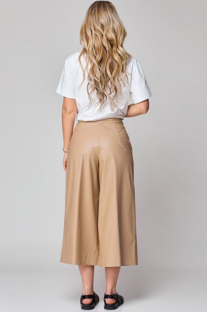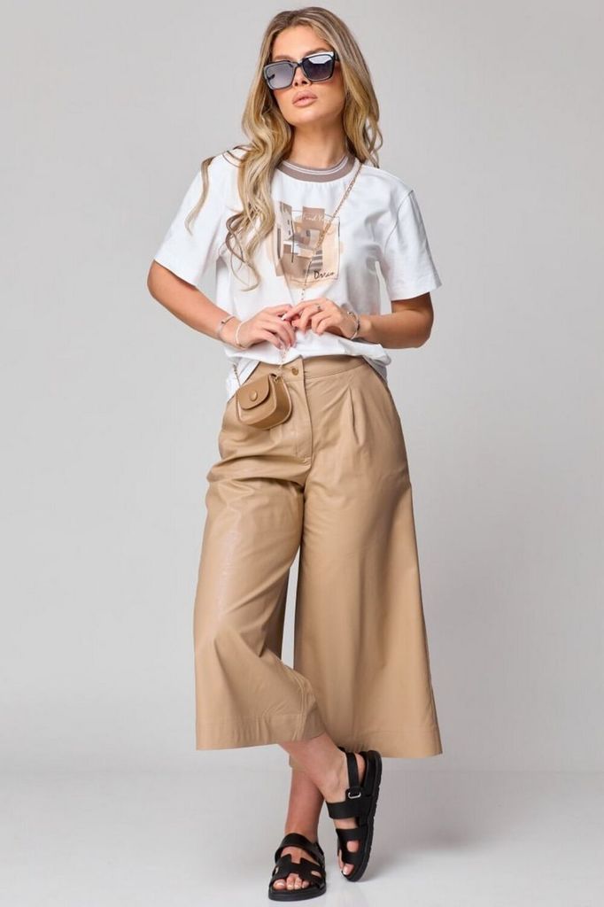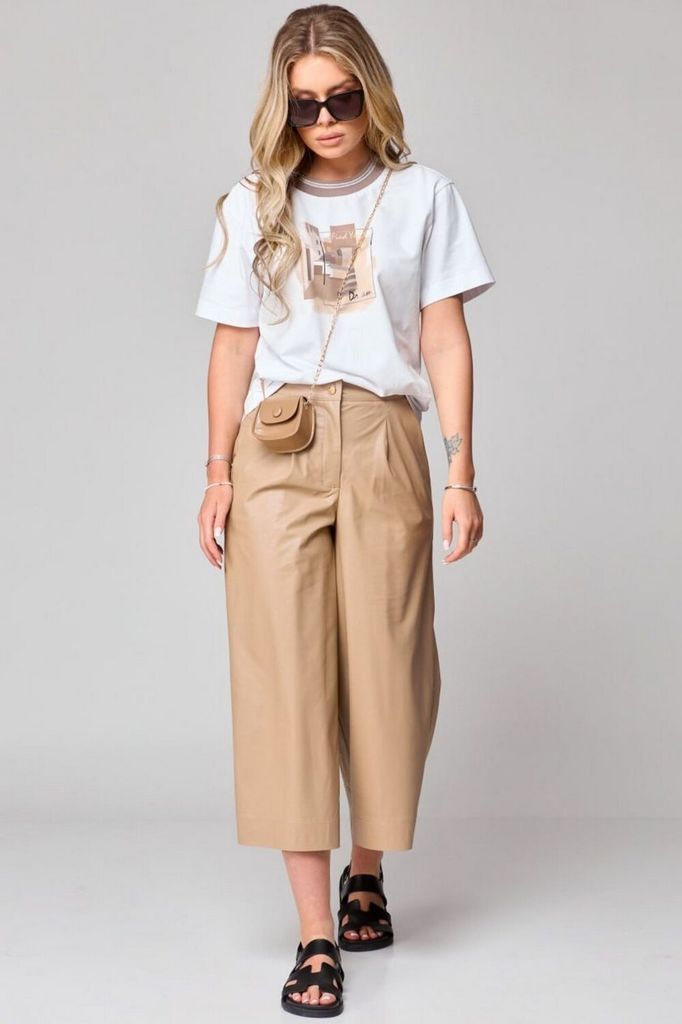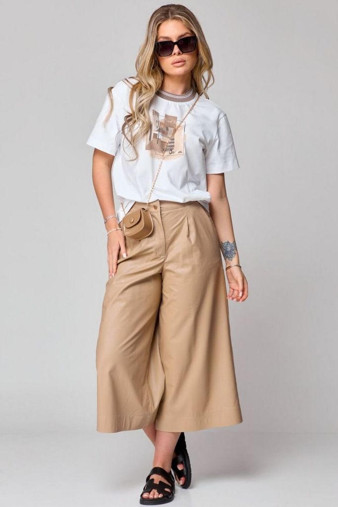 Состав: Брюки: ПУ-100%; Брюки: Вискоза-100%; Кюлоты с высокой талией, расширенные к низу, с притачным поясом. Застежка на тесьму-молнию и 1 петлю и пуговицу-болт. На передних половинках обработаны по... Показать описание 1 складке-вытачке, в боковых швах наклонные карманы. На задних частях брюк обработаны по 1 вытачке на каждой половинке. Брюки: длина по боковому шву – 80см.