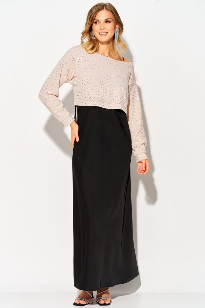 Состав: Джемпер: ПЭ-90%; Хлопок-6%; Эластан-4%; Платье: ПЭ-100%; Нарядный комплект от LAIKONY, состоящий из трикотажного джемпера и платья из атласа. Джемпер свободного силуэта, длиной до линии талии,... Показать описание со спущенной линией плеча, с втачными рукавами. Вырез горловины формы «лодочка», с втачной бейкой. Рукава втачные одношовные, с притачными манжетами. Длина джемпера по спинке 38-42 см в зависимости от размера, длина рукава 50 см от шва втачивания. Платье полуприлегающего силуэта, длиной «в пол», на бретелях, с «V-образным» вырезом горловины спинки и переда. Деталь переда платья с нагрудными вытачками, горловина оформлена декоративным кружевом. Длина изделия по спинке 118 см. Наш стильный комплект будет актуален как на новогоднем корпоративе, так и на любом другом торжественном мероприятии!