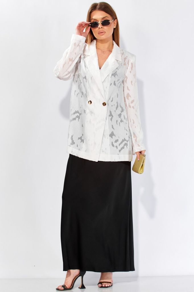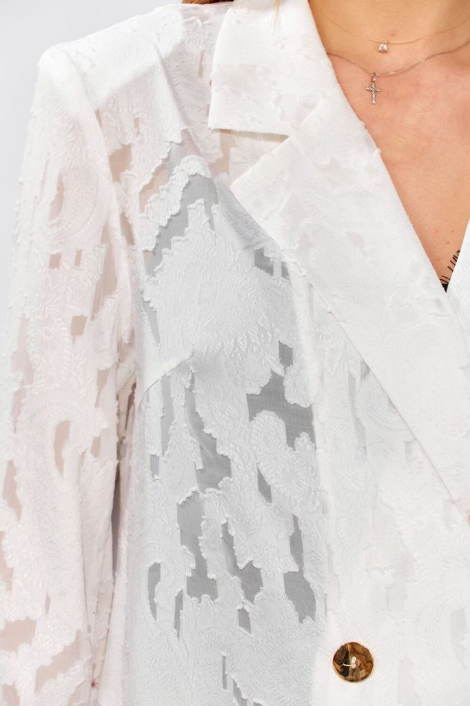 Состав: Вискоза-12%; ПЭ-88%; Жакет свободного силуэта от LAIKONY из полупрозрачного гипюра. Наш стильный жакет длиной ниже линии бедер идеально сочетает в себе элегантность и комфорт. Отложной воротни... Показать описаниек пиджачного типа с прямыми углами создает строгий и одновременно стильный образ. Двубортная застёжка, выполненная на одну петлю и пуговицу, а также потайная петля с пуговицей до линии перегиба лацкана, придаёт изделию изысканный вид. Нагрудные вытачки на деталях переда и плечевые вытачки на спинке обеспечивают идеальную посадку. Рукава жакета втачные, двухшовные, с продуманными передними и локтевыми швами. Длина изделия по спинке 74 см, длина рукава 61,5 см. Этот нарядный жакет станет отличным выбором для корпоративов и других торжественных мероприятий, позволяя вам выглядеть стильно и уверенно в любой ситуации. На фото с нашим платьем L-504-2.