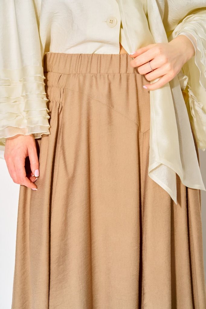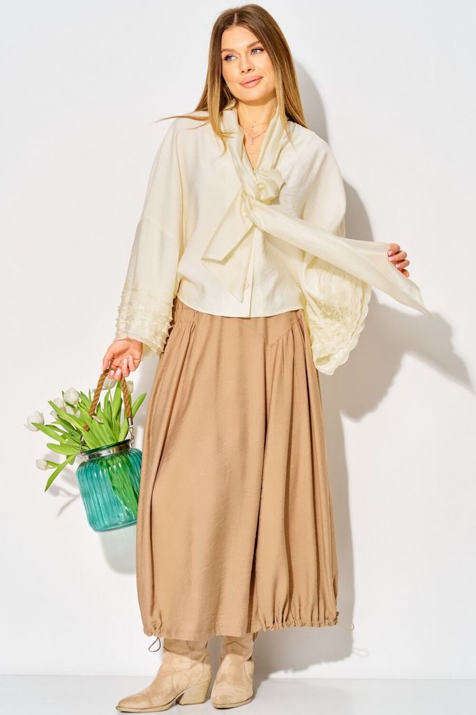 Состав: Вискоза-85%; Нейлон-15%; Изысканный комплект от LAIKONY в стиле бохо, состоящий из блузы и юбки. Блуза свободного силуэта длиной чуть выше линии бедер очаровывает своей легкостью и элегантност... Показать описаниеью. линия плеча спущена. Вырез горловины V-образный с элегантным шалевым воротником. Втачные рукава с изящными воланами, застежка центральная на три пуговицы. Юбка длиной в пол создана для тех, кто ценит комфорт и стиль. Силуэт свободный, плавно расширяющийся к низу. Притачной пояс с эластичной тесьмой обеспечивает идеальную посадку на талии. Рельефные швы и кокетки на переднем полотнище придают юбке структуру и оригинальность, на правой кокетке эластичная тесьма. Низ юбки оформлен фиксирующими элементами. Комплект выполнена из вискозы с крэш-эффектом. Ткань средней плотности, не тянется. Длина блузы по спинке 54 см., длина рукава 65 см. от горловины. Длина юбки 80 см. Этот комплект — идеальный выбор для современных женщин, которые хотят выглядеть стильно и чувствовать себя комфортно в любой обстановке. Позвольте себе роскошь быть неповторимой!