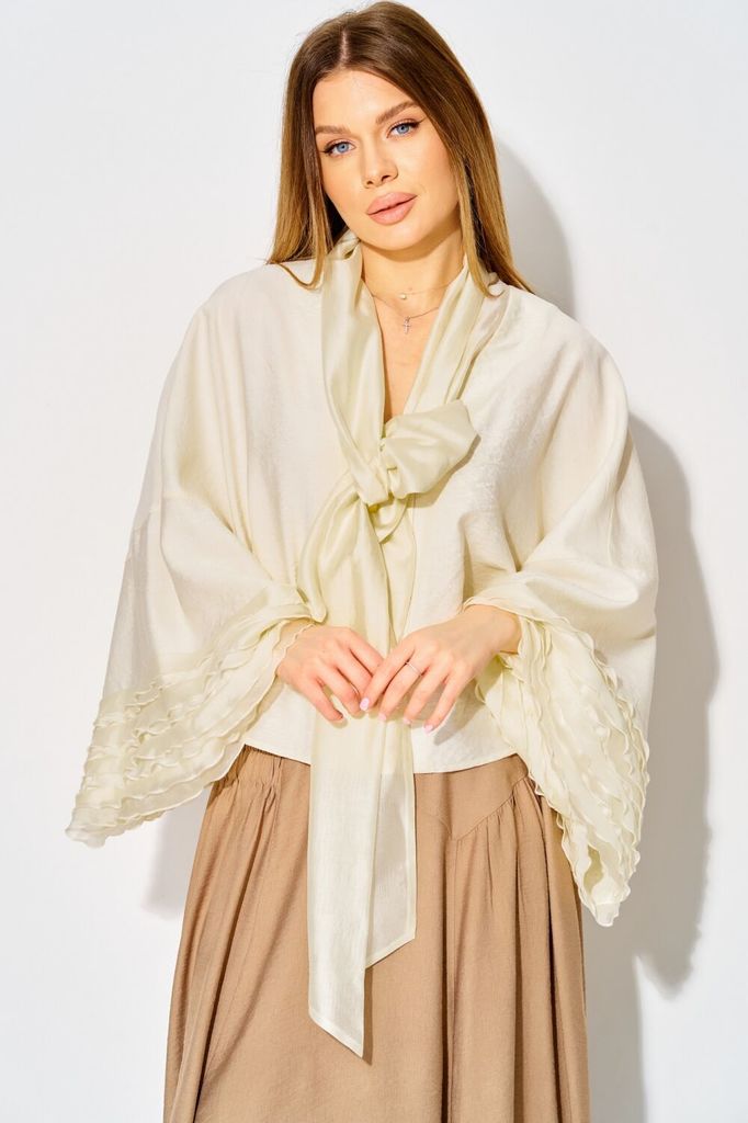 Состав: Вискоза-12%; ПЭ-88%; Нарядная блуза от LAIKONY свободного силуэта из шифона. Блуза длиной до линии бедер с центральной застёжкой на декоративную тесьму-молнию. Вырез горловины блузки «под горл... Показать описаниео», обработан планкой. Деталь переда и спинки с кокеткой из отделочной ткани, в шов вставлены два волана. Деталь переда кокетки со средним швом, с разрезом и по горловине вставлена тесьма-шнур. Рукава втачные одношовные, понизу собраны на эластичную тесьму. В низ блузки вставлена эластичная тесьма. Длина изделия по спинке 61 см длина рукава 64 см. Наша блуза составит нарядный образ с брюками L-942-2 (на фоото) - и вы будете блистать на любом торжественном мероприятии.
