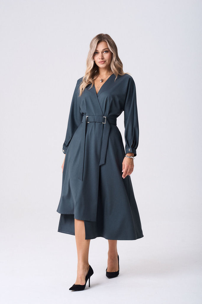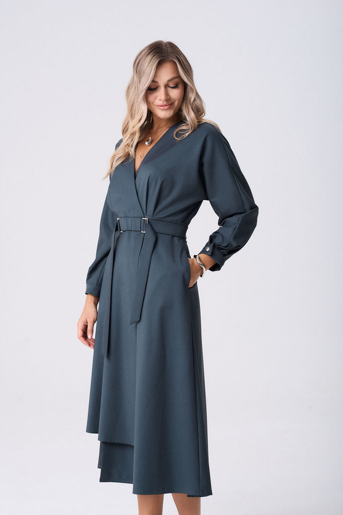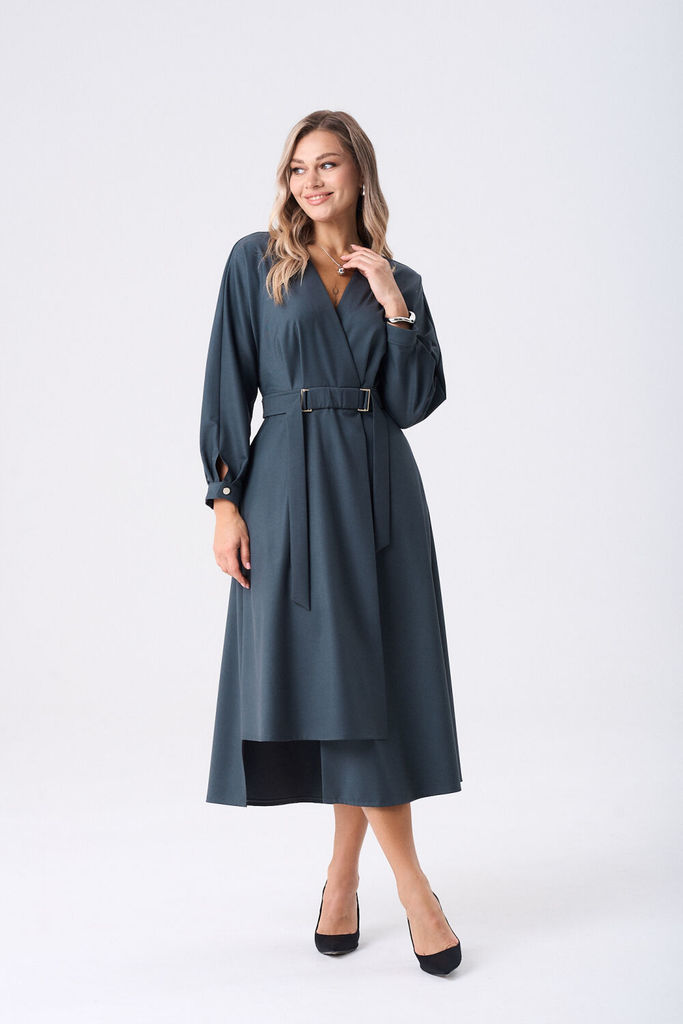 Состав: Вискоза-62%; ПЭ-32%; Спандекс-6%; Платье женское полуприлегающего силуэта длинной миди. Платье отрезное по линии талии, на запах, с односторонними складками от пояса. Юбка платья по полочки ас... Показать описание симетричная, слегка расклешённая к низу. По талии приточной пояс, застегивающийся на пришивные кнопки, который дополнен отлетным поясом фиксирующийся рамками. В боковых швах обработаны карманы. Рукава цельнокроеные, по низу притачная манжета, застёгивающаяся на петлю и пуговицу. Наименование измерений Размеры (см) Допустимые(см) отклонения +/- 46 48 50 52 54 56 Обхват груди 92 96 100 104 108 112 Обхват бедер 100 104 108 112 116 120 Рост 170 170 170 170 170 170 +/- 1см. Длина спинки 127 127 127 127 127 127 +/- 1см. Ширина изделия на уровне глубины проймы 86 90 94 98 102 106 +/- 1см. Ширина изделия на уровне линии талии 76 80 84 88 92 96 +/- 1см. Ширина изделия на уровне линии бёдер 106 110 114 118 122 126 +/- 1см. Ширина изделия в низу 204 208 212 216 220 224 +/- 1см Длина рукава от плеча 70 70 70 70 70 70 +/- 1см Ширина рукава в низу 26 26 26 29 29 29 +/- 1см Ширина рукава в верху 46 48 50 52 54 56 +/- 1см