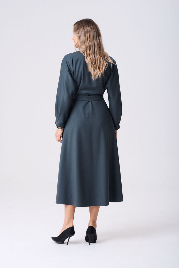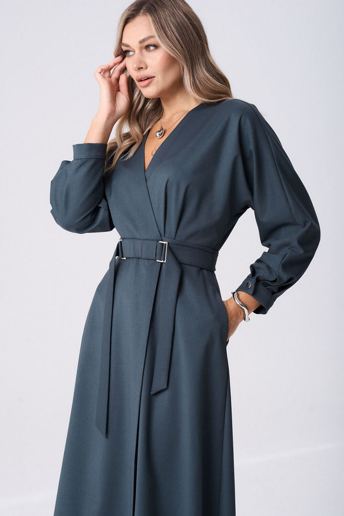 Платье женское полуприлегающего силуэта длинной за колено из легкой плательной ткани. Спинка платья цельнокроеная в области лопаток декоративные подрезы, так же обработаны талиевые выточки для лучшей ... Показать описание посадки изделия по фигуре. По полочке центральная застежка на цельнокроеных планках, застегивающихся на петли и пуговицы. Воротник – стойка. Рукава втачные, длинные по низу притачная манжета, застегивающаяся на петлю и пуговицу. Для удобства в боковых швах обработаны карманы. Платье дополнено съёмным поясом из основной ткани.