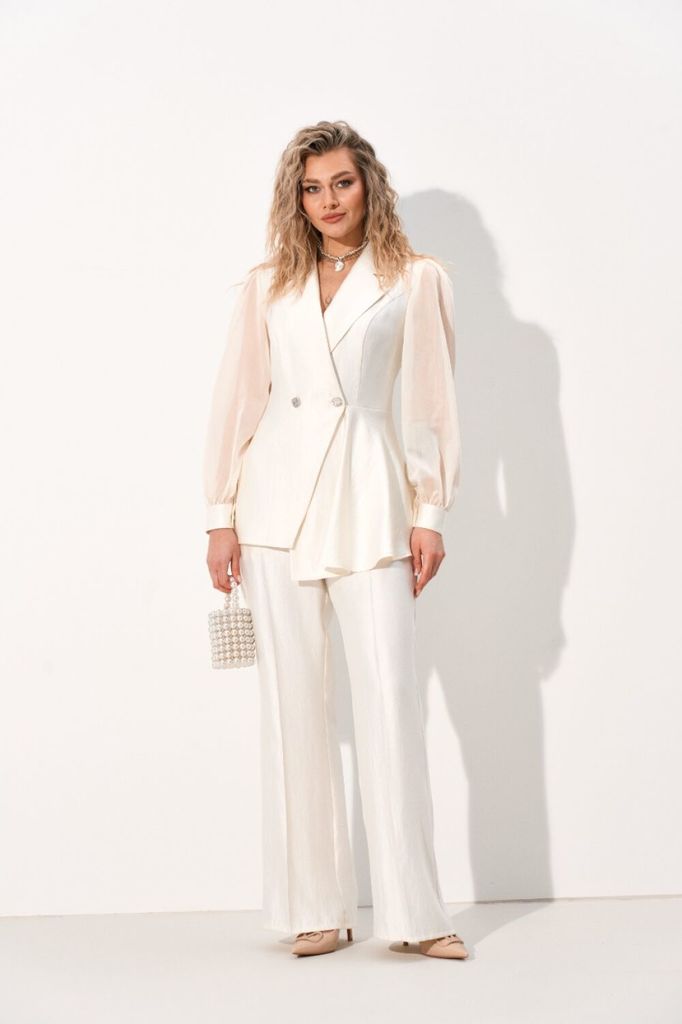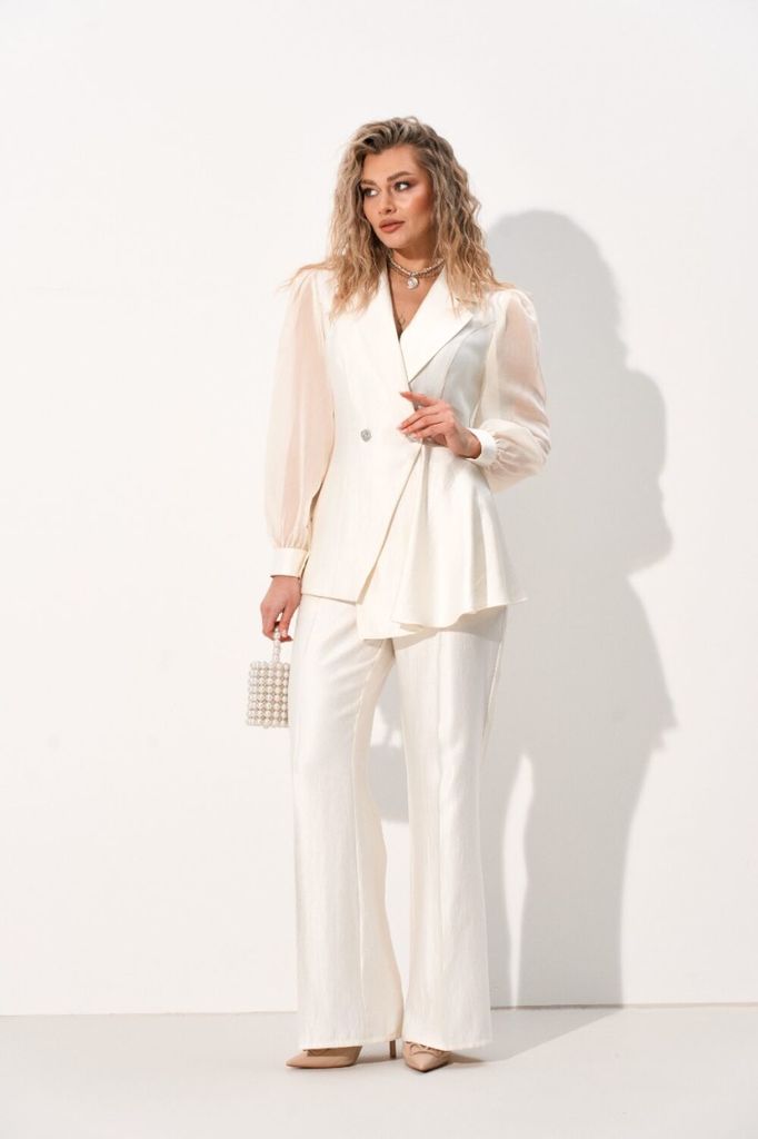 Состав: Костюм: Вискоза-47%; Нейлон-38%; ПЭ-15%; Костюм: ПЭ-20%; Тенсел-80%; Костюм женский полуприлегающего силуэта выполнен из костюмной ткани с перламутровым отливом что придаёт образу изысканность... Показать описание . Жакет имеет асимметричный покрой полочек, на левой полочке обработана баска что придаёт образу индивидуальность. По полочке и спинке обработаны рельефы благодаря чему жакет садится идеально по фигуре. Застёжка центральная застёгивающаяся на петли и пуговицы, воротник пиджачный. Рукава втачные выполнены из полупрозрачной органзы, по окату небольшая сборка что придаёт образу легкость, по низу рукава притачная манжета на петлю и пуговицу. Брюки прямого силуэта слегка расклешённые к низу. В боковом шве обработан карман с отрезным бочком. Застежка центральная на тесьму-молнию, верхний срез обработан притачным поясом с шлёвками для ремня, затягивающийся на петлю и пуговицу, по спинке вставлена резинка благодаря чему брюки садятся на любую талию.