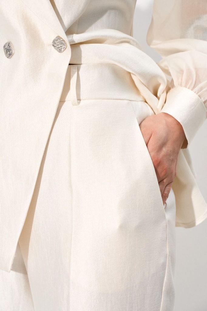 Состав: Вискоза-70%; Лён-30%; Базовый брючный комплект состоящий из блузки и элегантных прямых брюк. Блузка прямого силуэта, линия плеча удлинённая переходящая в цельнокроеный рукав. По боковому шву, ... Показать описание горловине и по низу рукава вставлен акцентный контрастный кант. Спинка со средним швом, по горловине для удобства обработана капелька на петлю и пуговицу. По полочке в области талии закреплены удлинённые паты-шлёвки, закрепленные пуговицами для фиксации пояса. Брюки прямого силуэта по боковому шву вставлен акцентный контрастный кант, благодаря этому элементу зрительно вытягивается силуэт, верхний срез брюк обработан притачным поясом с эластичной тесьмой, в боковых швах обработан карман с отрезным бочком. Комплект дополнен съёмным поясом с эластичной тесьмой, застегивающейся на карабин в цвет канта. Наименование измерений Размеры (см) Допустимые(см) отклонения +/- 50 52 54 56 58 60 Обхват груди 100 104 108 112 116 120 Обхват бедер 108 112 116 120 124 128 Рост 170 170 170 170 170 170 +/- 1см. Длина спинки 62 62 62 62 62 62 +/- 1см. Ширина изделия на уровне глубины проймы 112 116 120 132 136 140 +/- 1см. Ширина изделия в низу 114 118 122 134 138 142 +/- 1см Длина рукава 27 27 27 27 27 27 +/- 1см. Ширина рукава в низу 42 44 46 48 50 52 +/- 1см. Наименование измерений Размеры (см) Допустимые(см) отклонения +/- 50 52 54 56 58 60 Обхват груди 100 104 108 112 116 120 Обхват талии 82 86 90 94 98 100 Обхват бедер 108 112 116 120 124 128 Рост 170 170 170 170 170 170 +/- 1см. Длина брюк по боковому шву 105 105 105 105 105 105 +/- 1см. Ширина брюк по линии бедер 114 118 122 126 130 134 +/- 1см. Ширина брюк по линии талии с учетом резинки 82 86 90 94 98 100 +/- 1см. Ширина брюк внизу изделия 60 62 64 72 74 76 +/- 1см. Ширина пояса 4 4 4 4 4 4 +/- 1см Ширина брюк на уровне колена 58 60 62 70 72 74 +/- 1см. Длина брюк по шаговому шву 80 80 80 80 80 80 +/- 1см.