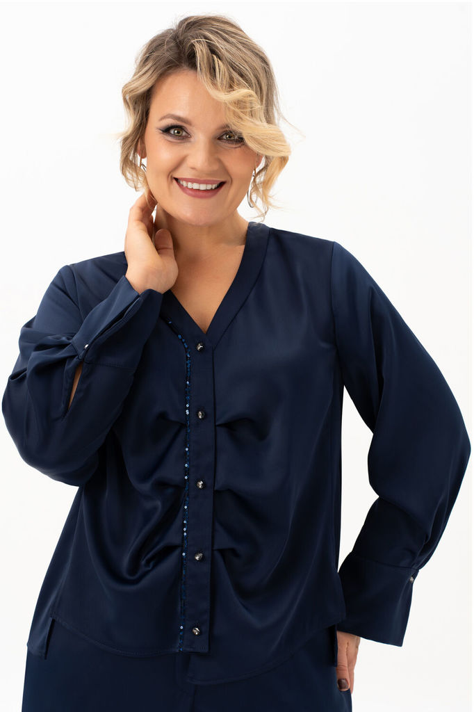 Состав: ПЭ-95%; Эластан-5%; Сезон: Весна Рост: 170 Страна бренда: Беларусь Состав: ПЭ-95%; Эластан-5%; Нарядно- повседневевя , элегантная  женская блузка  — настоящая находка для тех, кто ищ... Показать описаниеет идеальный образ на праздник, свадьбу или важный вечер. Безупречно смотрится на большом мероприятии, создавая образ, полный уверенности и шарма. Блуза выполнена из шелковистой ткани с приятной фактурой. Блузка с длинными струящимися рукавами выглядит очень изящно и очаровательно. Блузка без воротника, застежка на петли и пуговицы по планке, с V – образным вырезом горловины. Спинка с декоративным элементом из паеток. По переду вдоль планок заложены складки и обработан кант из паеток. Изделие  асимметрично  по низу. Боковые швы перенесены в линию рельфа полочки и спинки. В рельефах полочки обработаны разрезы. Рукав со складкой по шву притачивания манжеты. Прямого силуэта с втачным , длинным рукавом. С данной блузой можно создать  красивый костюм или комплект  строгого силуэта — идеальное сочетание для торжеств и даже для делового офисного дресс кода. Подходит для женщин больших и полных размеров, продуманный крой визуально стройнит, подчёркивает талию и скрывает лишнее. Создайте идеальный образ — выберите блузу от "Альгранда" и подчеркните свою индивидуальность! Длина изделия (см): 68 Длина рукава (см): 62