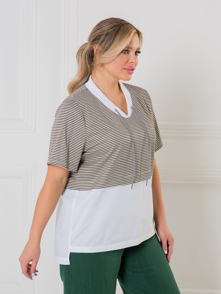 Состав: Вискоза-60%; ПЭ-37%; Эластан-3%; Сезон: Весна Рост: 164 Страна бренда: Россия Состав: Вискоза-60%; ПЭ-37%; Эластан-3%; Удобная повседневная блузка свободного силуэта, выполнена в сочетании дву... Показать описаниех видов ткани. Верхняя часть блузки выполнена из мягкого трикотажного полотна, нижняя часть из ткани компаньона. Верхняя и нижняя части переда и спинки целые. По шву притачивания верха с низом отлетная складка. Горловина переда и спинки обработана планкой из отделочной ткани-рибана с декоративным шнурком. Рукав втачной короткий. Длина рукава в 50 р-ре – 23 см. в 64 р-ре – 26 см. Ширина рукава по низу в 50 р-ре – 40 см. в 64 р-ре – 50 см. низ блузки разно-уровневый, спинка длиннее переда на 5 см. Блузка без подклада и застежек. Длина изделия по спинке в 50 р-ре – 70 см. в 64 р-ре – 77 см. На фото представлена в комплекте с брюками арт.: 1315 зеленый