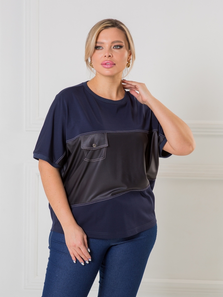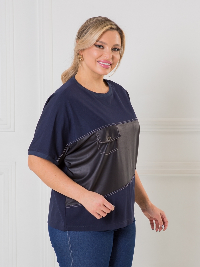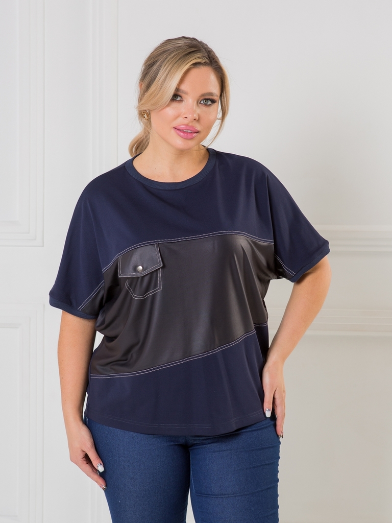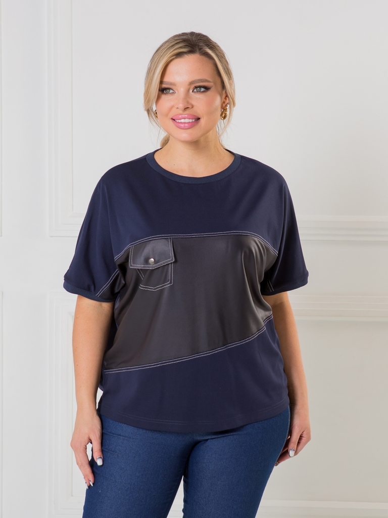 Состав: Вискоза-37%; ПЭ-60%; Эластан-3%; Сезон: Весна Рост: 164 Страна бренда: Россия Состав: Вискоза-37%; ПЭ-60%; Эластан-3%; Повседневная блузка свободного силуэта, выполнена в сочетании трикотажног... Показать описаниео полотна и тонкой эко-кожи. Блузка с цельнокроеным коротким рукавом и свободной заниженной проймой. Длина рукава от горловины в 50 р-ре – 36 см. в 64 р-ре – 42 см., ширина рукава по низу в 50 р-ре – 36 см. в 64 р-ре – 48 см. Перед из трех частей с имитацией нагрудного кармана с клапаном. Средняя часть переда и клапан выполнены из отделочной ткани. Швы притачивания средней части переда, клапан и имитация кармана настрочены двойной отделочной строчкой, выполненной нитками контрастного цвета. Спинка со средним швом. Горловина переда и спинки, низ рукавов обработаны планками из отделочной ткани – рибана. Блузка без застежек и подклада. Длина изделия по спинке в 50 р-ре – 61 см. в 64 р-ре – 69 см.