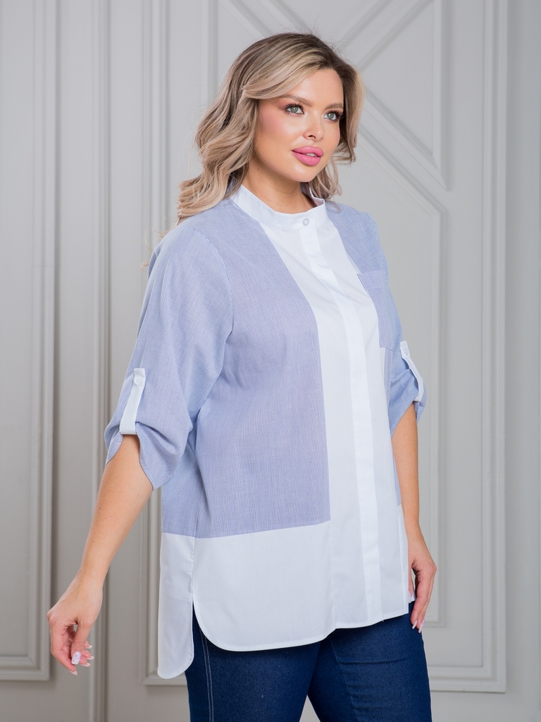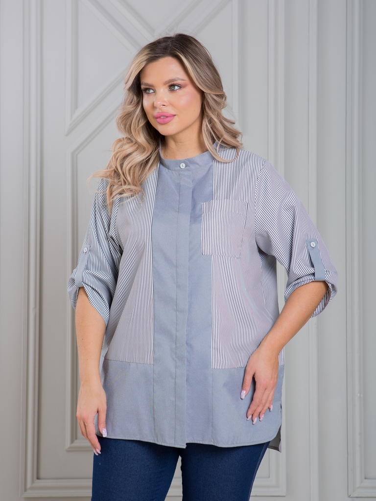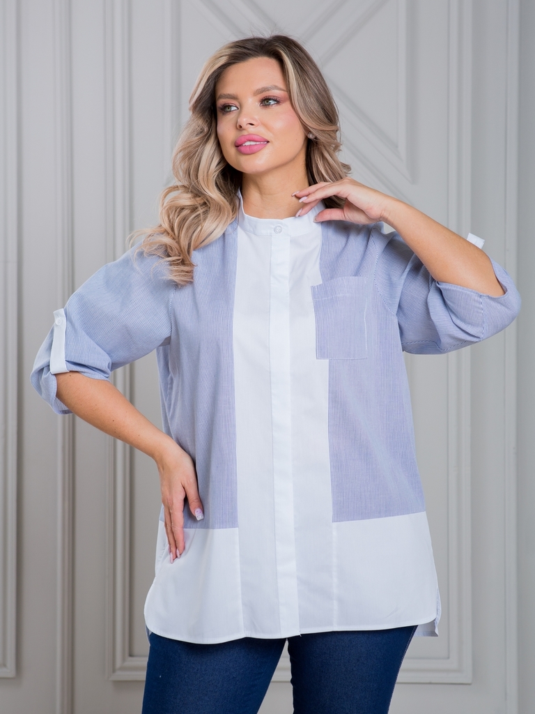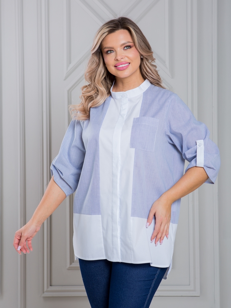 Состав: Вискоза-25%; ПЭ-75%; Сезон: Весна Рост: 164 Страна бренда: Россия Состав: Вискоза-25%; ПЭ-75%; Оригинальная повседневная блузка-рубашка, свободного силуэта, выполнена из сорочечной ткани в соч... Показать описаниеетании 2-х цветов. Блузка по переду с супатной застежкой. Перед с отрезными нижней и средней частями. На левой стороне блузки небольшой накладной карман. Спинка с отрезной нижней частью горловина переда и спинки с воротником-стойка. Рукав втачной, длиной 3/4 с патой по низу. Пата с застежкой на петлю и пуговицу, позволяет регулировать длину рукава. Длина рукава в 50 р-ре – 43 см. в 62 р-ре – 46 см., ширина рукава по низу в 50 р-ре – 34 см. в 62 р-ре – 40 см. Низ блузки фигурный, спинка длиннее переда на 5 см. Блузка без застежек и подклада. Длина изделия по спинке в 50 р-ре – 80 см. в 62 р-ре – 86 см.