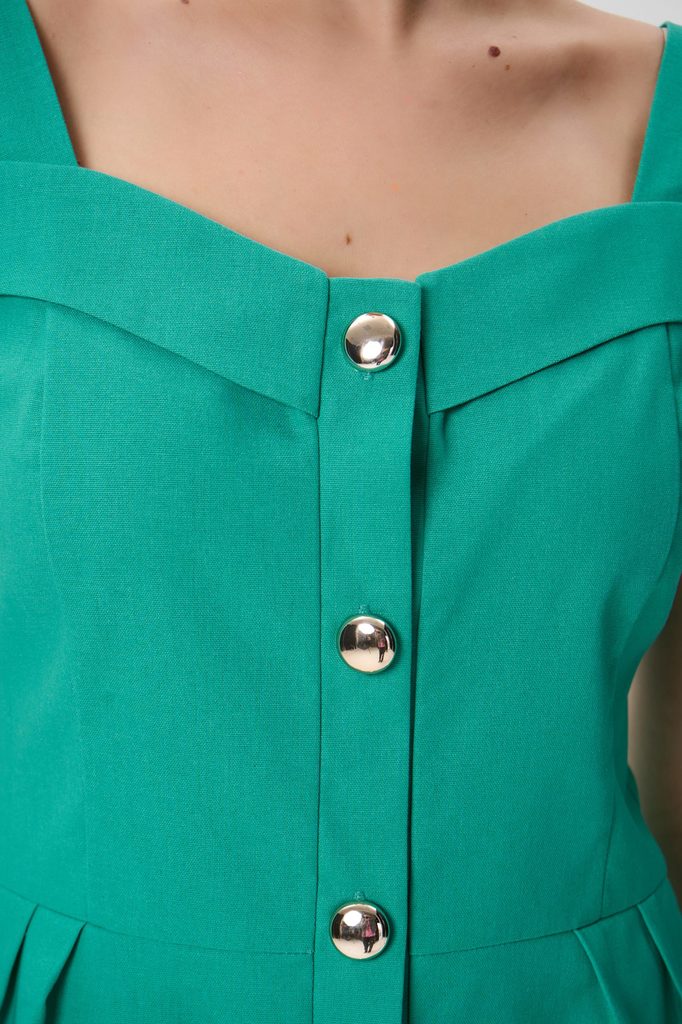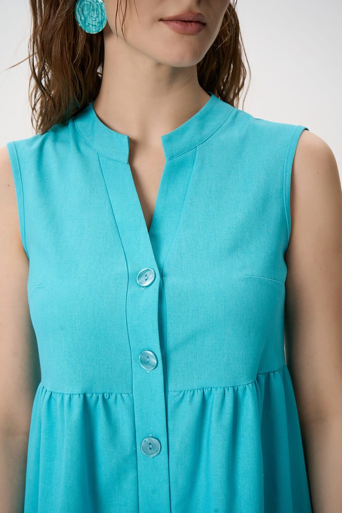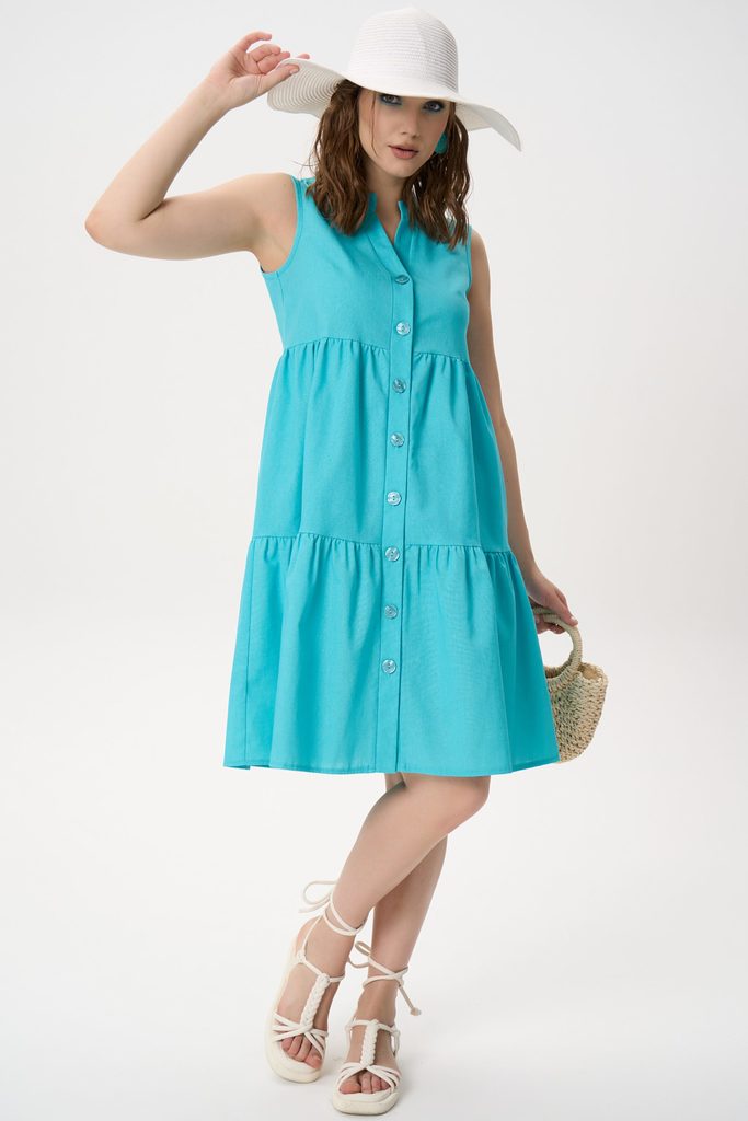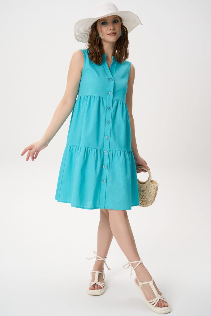 Состав: 50% – хлопок, 30% – вискоз, 20% – лён Описание Легкое летнее платье свободного силуэта, созданное для комфорта в жаркую погоду. Модель сочетает женственность и практичность: воздушный крой, мя... Показать описаниегкая посадка и натуральное настроение образа делают платье универсальным вариантом для города, отдыха и путешествий.Свежий бирюзовый оттенок подчеркивает загар и визуально освежает образ, а лаконичный дизайн позволяет легко менять стилизацию — от casual до отпускного гардероба.Платье выполнено в А-образном свободном силуэте с ярусной конструкцией, формирующей мягкий объем без утяжеления фигуры. Детали: отрезная линия выше талии с легкой сборкой; второй ярус со сборкой по горизонтальному шву; центральная бортовая застёжка на пуговицы по всей длине изделия; V-образная горловина с аккуратной планкой; пройма обработана обтачкой; модель без рукавов; длина выше колена. Сборки создают естественную драпировку и обеспечивают свободу движения. Силуэт: А-образный, ярусный Длина: выше колена Горловина: V-образная Рукав: отсутствует Застёжка: пуговицы спереди Карманы: не предусмотрены Сезон: весна–лето Состав:
