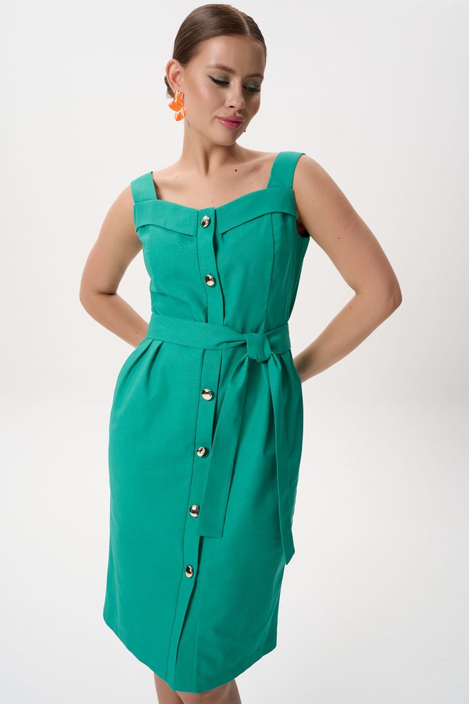 Состав: 50% – хлопок, 30% – вискоз, 20% – лён Описание Лаконичный сарафан из натурального льна — идеальный баланс комфорта, женственности и современного силуэта. Модель создана для тёплого сезона: лёг... Показать описаниекая, дышащая ткань и продуманный крой обеспечивают удобную посадку и элегантный внешний вид как для повседневных образов, так и для городских летних выходов. Полуприлегающий силуэт, мягко подчёркивающий фигуру без излишнего облегания. Длина — до колена. Конструкция верха: Прямой лиф с широкими бретелями Фигурная линия горловины с аккуратным декоративным перекрытием Комфортная посадка в области груди и плеч Застёжка: Центральная планка по переду Функциональная застёжка на пуговицы по всей длине изделия Талия: Съёмный пояс из основной ткани Позволяет регулировать объём и формировать более женственный силуэт Юбка: Прямая, слегка зауженная к низу Обеспечивает свободу движения и аккуратный внешний вид Натуральная дышащая ткань Хорошо пропускает воздух, комфортна в жаркую погоду Обладает характерной льняной фактурой