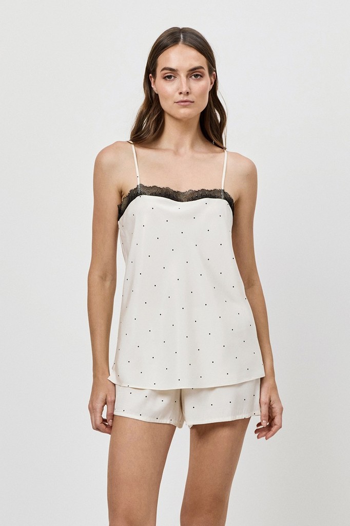 Побалуйте себя роскошной гладкостью пижамы ADA. Пижама женская с шортами. Топ на тонких регулируемых бретелях, декорирован нежным кружевом. Шорты короткие, свободной комфортной посадки, по бокам разре... Показать описаниезы, пояс на эластичной резинке. Выполнена из шелковистой атласной вискозы. Принт мелкий горошек.