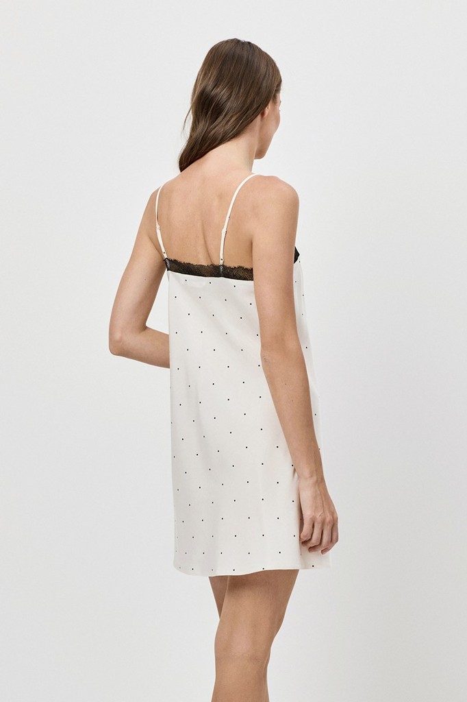 Побалуйте себя роскошной гладкостью сорочки ADA. Сорочка на тонких регулируемых бретелях, декорирована контрастным кружевом. Выполнена из шелковистой атласной вискозы. Принт мелкий горошек.