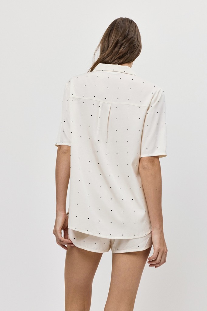 Побалуйте себя нежностью халата ADA. Этот короткий халат с поясом на запах и свободными рукавами создан из атласной шелковистой вискозы. Его украшает мелкий узор в виде горошка.