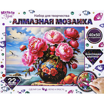 Набор для детского творчества алмазная мозаика Пионы с видом на море ТМ Мульти Арт - отличный подарок для ребёнка, который будет способствовать развитию его творческих способностей. Особенности и ком... Показать описаниеплектация: - с полным заполнением - 22 цвета - основа для мозаики размером 40 х 50 см - холст на подрамнике с нанесенной схемой рисунка - комплект стразов - металлический пинцет - клеевая подушечка - ёмкость для стразов - комплект креплений - инструкция на упаковке При помощи этого набора маленький художник сможет создать красивую картинку-мозаику, декорированную сверкающими стразами. Яркую блестящую поделку можно подарить близким или использовать для украшения комнаты. Творческие занятия с алмазной мозаикой ТМ Мульти Арт обладают успокаивающим действием, а также развивают: - творческое мышление - цветовое восприятие - усидчивость - внимание - аккуратность Размер: 43 x 53 x 2 см. Материал: картон + пластмасса. Рекомендовано детям от 3-х лет.