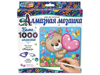 Набор для детского творчества алмазная мозаика Мишка ТМ Мульти Арт - отличный подарок для ребёнка, который будет способствовать развитию его творческих способностей. Особенности и комплектация: - бол... Показать описаниеее 1000 деталей - основа для мозаики размером 20 х 20 см - комплект страз - ёмкость для страз - подставка - специальный инструмент - без клея и ножниц - инструкция При помощи этого набора маленький художник сможет создать красивую картинку-мозаику, декорированную сверкающими стразами. Яркую блестящую поделку можно подарить близким или использовать для украшения комнаты. Творческие занятия с алмазной мозаикой ТМ Мульти Арт обладают успокаивающим действием, а также развивают: - творческое мышление - цветовое восприятие - усидчивость - внимание - аккуратность Размер упаковки: 2 x 21 x 21 см. Материал: картон + пластмасса. Рекомендовано детям от 3-х лет.