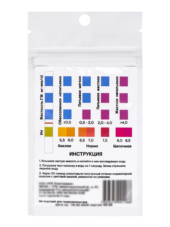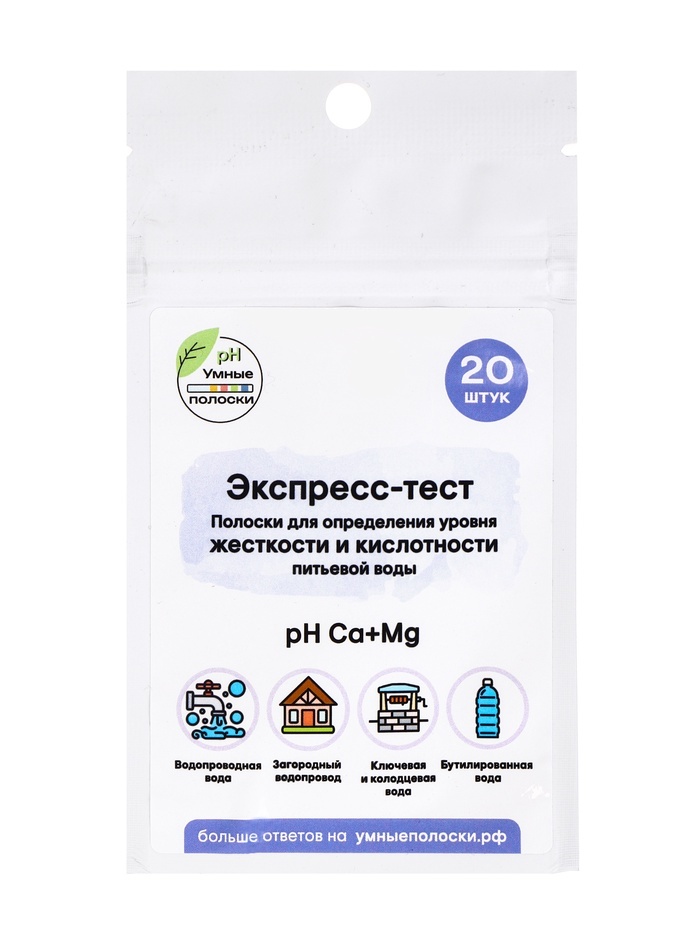 Тест-полоски для проверки жёсткости и pH питьевой воды, 20 шт. — удобный способ быстро провести анализ воды в домашних условиях. Индикаторная бумага помогает определить уровень кислотности и жёсткость... Показать описание воды из-под крана, фильтра, колодца или бутилированных источников. * Контроль качества воды: полоска меняет цвет при контакте с водой — по шкале легко определить показатель pH и степень жёсткости. * Домашний экспресс-анализ: проверку проводят без приборов и лабораторий — достаточно опустить тест в воду на небольшой промежуток времени. * Для разных источников: подходит для проверки водопроводной воды, воды после фильтра, колодезной и бутилированной воды. * Практичный набор: 20 тест-полосок удобно использовать для регулярного контроля качества воды дома, на даче или в офисе. Жёсткость и уровень pH влияют на вкус воды, образование накипи и работу бытовой техники. Проверка помогает оценить состояние воды после фильтрации, а также понять, подходит ли она для питья, приготовления пищи, аквариумов или бытовых приборов. Индикаторные тест-полоски — простой инструмент для регулярной проверки воды.
