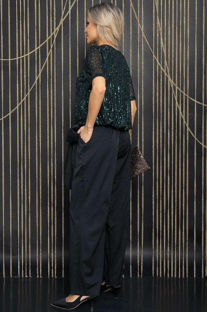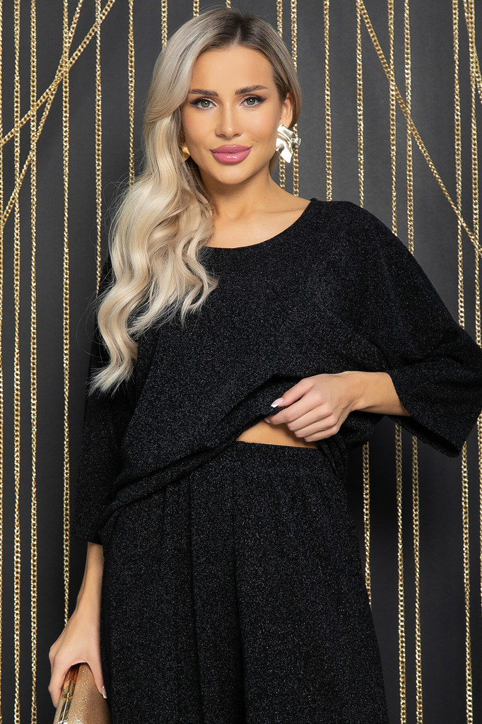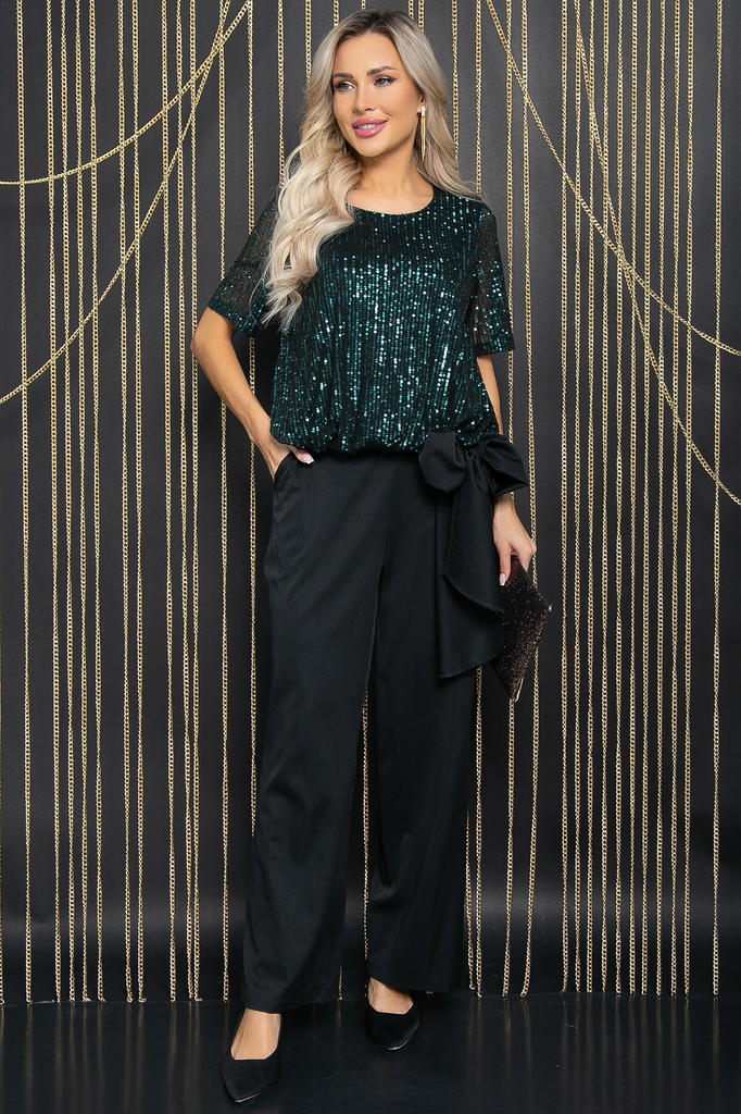 Артикул: Б12229-41. Тип ткани: синтетическая. Состав: 95% полиэстер, 5% эластан. Материал: трикотаж, пайетки. Цвет: чёрный. Принт: отсутствует. Вид застежки: без застёжки. Силуэт: свобо... Показать описаниедный. Карманы: отсутствуют. Подкладка: отсутствует. Декоративные элементы: пайетки на рукавах. Длина по спинке от верхней точки плеча: 46/ 69 см, 48/ 70 см, 50/ 72 см, 52/ 73 см, 54/ 74 см. Размер изделия на модели: 44 Рост модели: 168 см. Очаровательная блуза свободного кроя из мягкого трикотажа – идеальный выбор для стильных женщин. Украшенная блеском пайеток на рукавах, она придает образу неповторимый шарм. Изысканный дизайн и комфорт в одном – подчеркните свою неповторимость с этой блузой. Рукав укороченный, втачной. Уход за изделием: ручная стирка до 30 градусов; нельзя отбеливать; отжим запрещён; гладить при t не более 110 С; гладить с изнанки. Внимание! Рекомендуем ориентироваться на размерную сетку и выбирать свой привычный размер, согласно размерной таблице. *Допуск отклонения длины при массовом производстве 1-3 см является нормой.