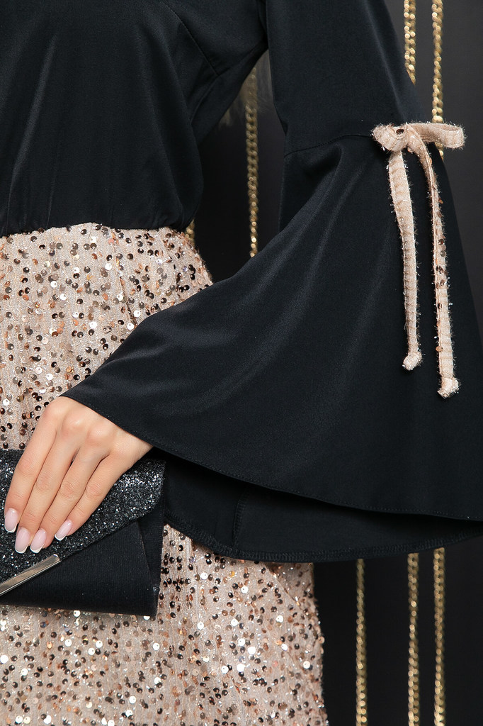 Артикул: П11997. Тип ткани: синтетическая. Состав: 95% полиэстер, 5% эластан. Материал: верх - плательная, юбка - трикотаж с пайетками. Цвет: черно-бежевый. Принт: отсутствует. Длина: м... Показать описаниеини. Вид застежки: капелька с пуговицей на спинке сзади. Силуэт: приталенный. Карманы: отсутствуют. Подкладка: есть. Декоративные элементы: бантики на рукавах. Длина по спинке от верхней точки плеча: 46/ 86 см, 48/ 87 см. Размер изделия на модели: 44 Рост модели: 168 см. Кокетливое платье, которое отлично подчёркивает фигуру. Сочетание двух видов тканей делает его интересным и необычным. Длина мини идеально подчеркивает и украшает ножки. Элегантное оформление горловины. Платье приталенное, талия на резинке. Втачной рукав, с воланом, придающий образу воздушности и шарма. Уход за изделием: ручная стирка до 30 градусов; нельзя отбеливать; отжим запрещён; гладить при t не более 110 С; гладить с изнанки. Внимание! Рекомендуем ориентироваться на размерную сетку и выбирать свой привычный размер, согласно размерной таблице. *Допуск отклонения длины при массовом производстве 1-3 см является нормой.