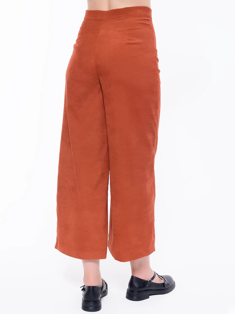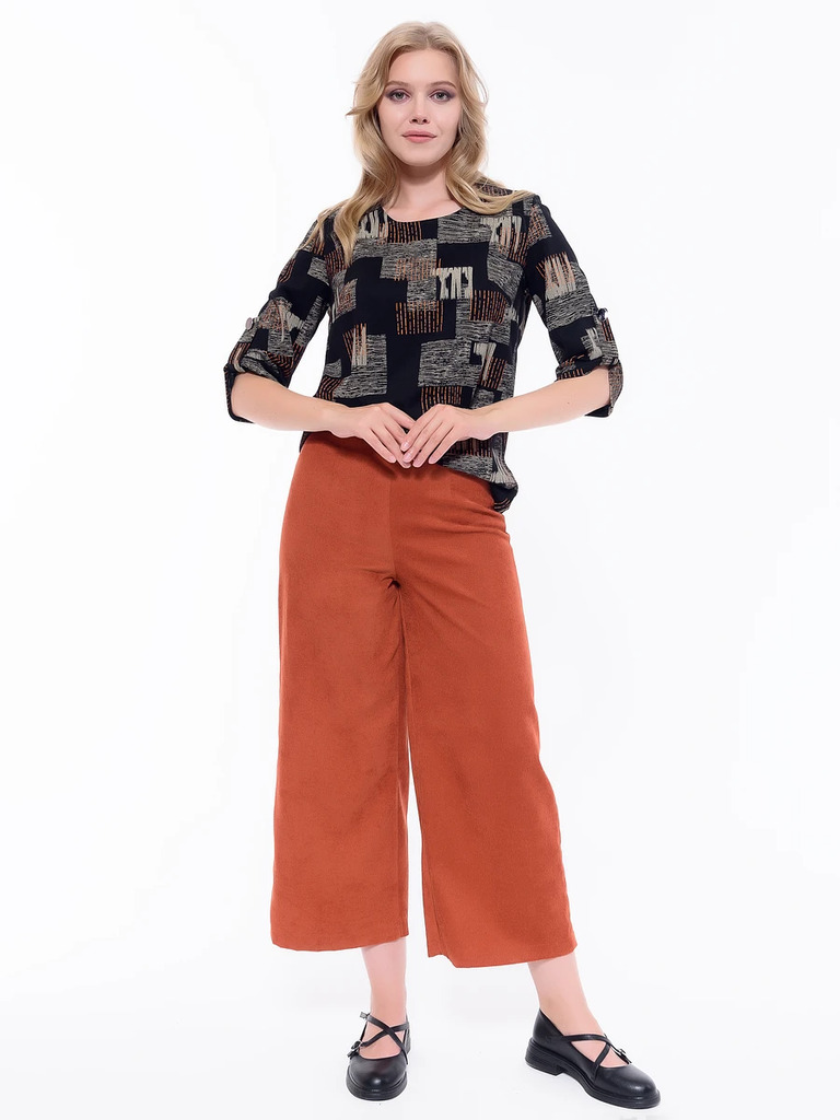 Широкие брюки неяркого коричневого оттенка длиной в пол – идеальный вариант для весеннего гардероба. Высокая посадка визуально удлиняет силуэт. Для изготовления модели с фигурной кокеткой на спинке и ... Показать описаниезакругленными боковыми карманами, как у джинсов, использовали мягкий микровельвет на основе вискозы. Застежка – гульфик, шлевки для кожаного ремня. На фото представлены с жилетом В-91 ВЛК(В4) и джемпером С-41 СКР(В4).
