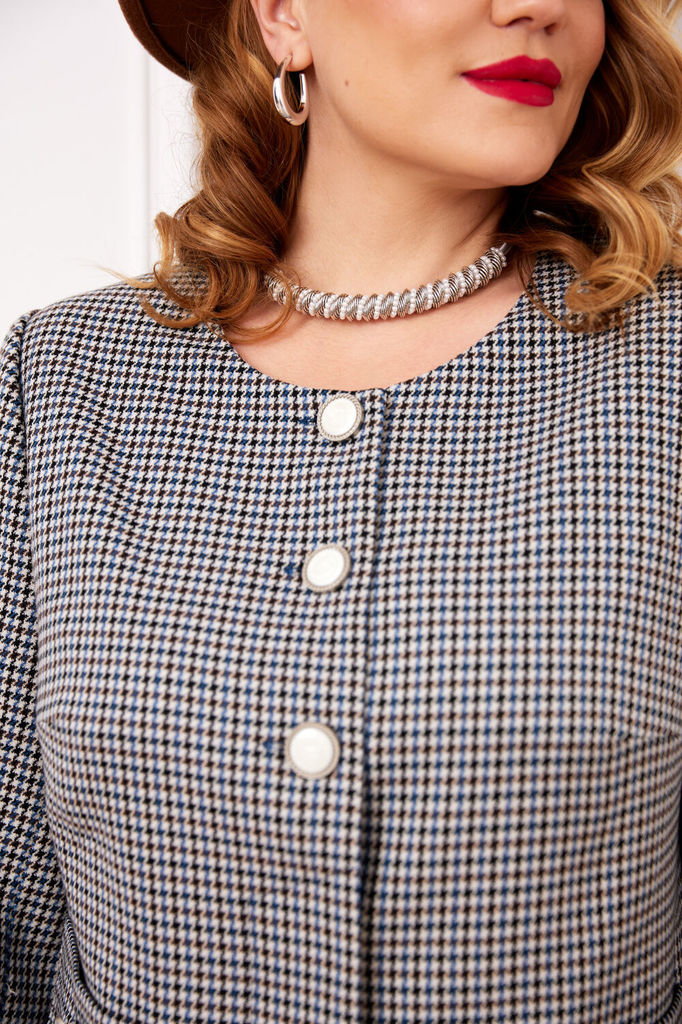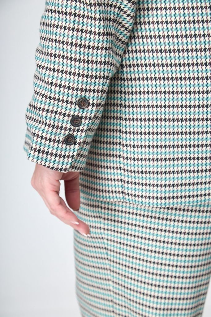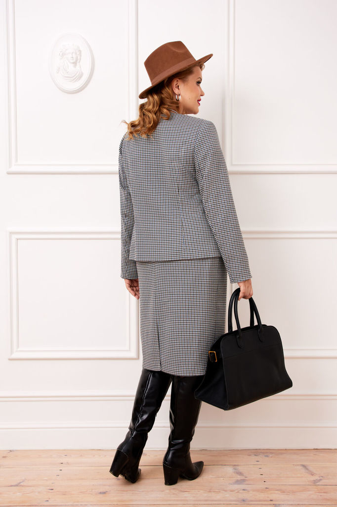 Состав: Вискоза-32%; ПЭ-65%; Эластан-3%; Сезон: Осень-Зима Рост: 164 Страна бренда: Беларусь Состав: Вискоза-32%; ПЭ-65%; Эластан-3%; Стильный женский костюм, состоит из жакета и юбки. Жакет полуприле... Показать описаниегающего силуэта, выполнен из костюмной ткани с добавлением вискозы с модным принтом гусиная лапка. Жакет полностью на подкладке, по переду с застежкой на три наружных пуговицы и три потайных. Жакет с накладными карманами, декорированные пришивной пуговицей. Рукав жакета втачной, полной длины. Юбка полуприлегающего силуэта, полностью на подкладке, на поясе, по бокам с резинкой. По спинке юбка с застежкой на потайную молнию и пуговицу, снизу с разрезом. Модель костюма стильная и практичная, невероятно стройнит, прекрасно подойдет для ежедневной носки, вы будете выглядеть неотразимо и роскошно.