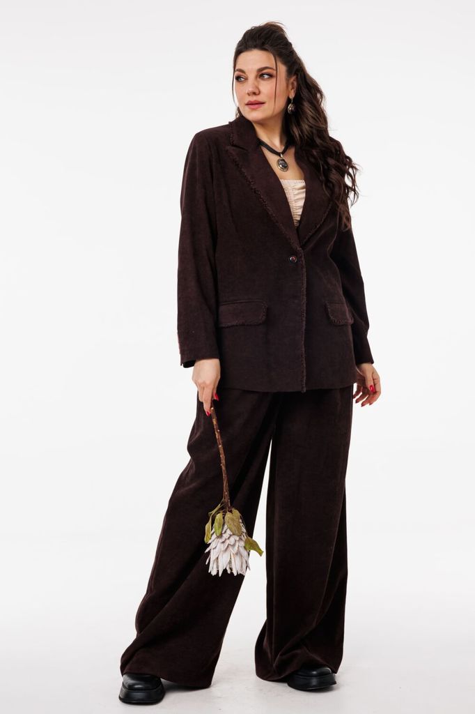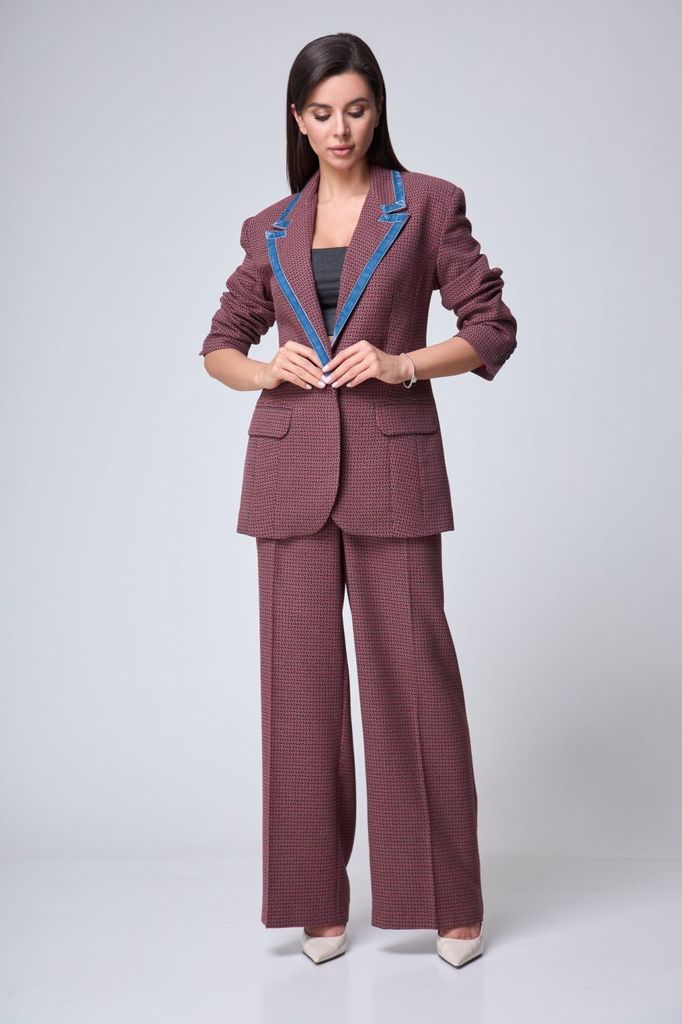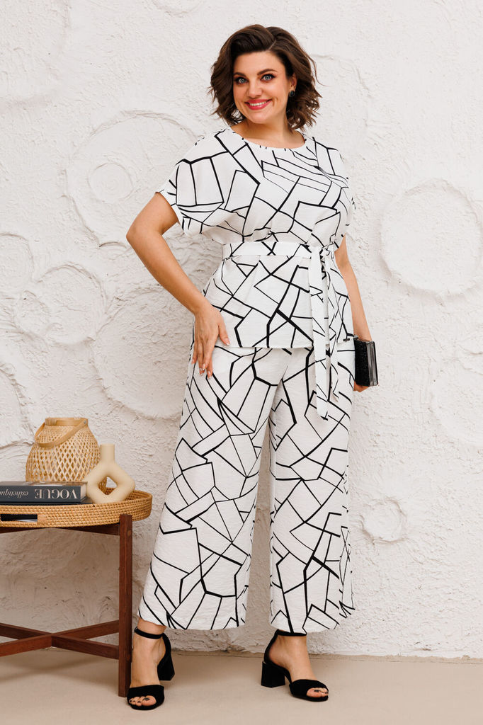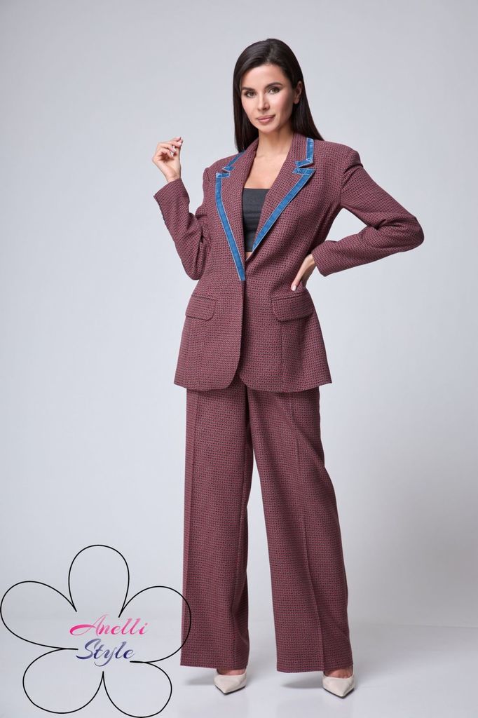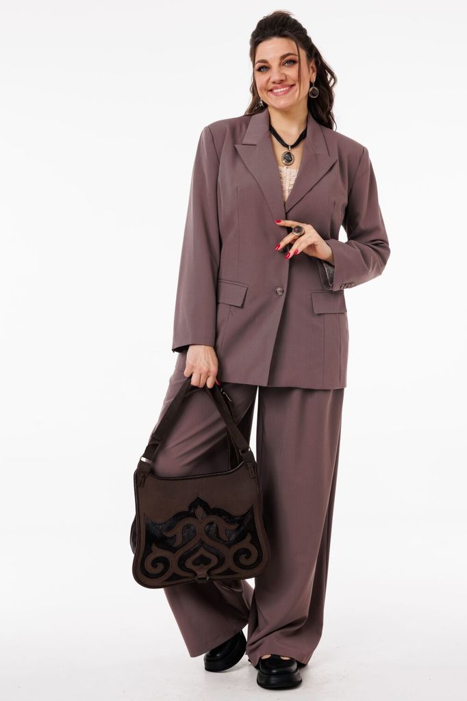 Состав: Костюм- ПЭ-40%; Хлопок-55%; Эластан-5%; Подкладка- Вискоза-60%; ПЭ-40%; Сезон: Весна Рост: 164 Страна бренда: Беларусь Состав: Костюм: ПЭ-40%; Хлопок-55%; Эластан-5%; Подкладка: Вискоза-60%; П... Показать описаниеЭ-40%; Погрузитесь в мир элегантности и стиля с нашим потрясающим костюмом-двойкой, который станет вашим незаменимым союзником в любых ситуациях. Жакет однобортного кроя с изысканной подкладкой, украшенный уникальным принтом, привносит нотку оригинальности в классический силуэт. Функциональные карманы с клапаном добавляют практичности, а отделка бахромой по всему костюму подчеркивает внимание к деталям и создает эффектный акцент. Брюки палаццо на притачном поясе с застежкой-молнией спереди не только подчеркивают вашу фигуру, но и обеспечивают комфорт в течение всего дня. Мягкие складки и широкие штанины делают этот элемент гардероба актуальным для наступившего сезона, добавляя легкости и воздушности вашему образу. Крой костюма от Anelli позволяет легко комбинировать его с водолазками, рубашками и блузами различных стилей, создавая как строго собранные, так и расслабленные образы. Будьте готовы привлекать внимание и вызывать восхищение в любом окружении! На модели представлен топ под артикулом 1440. Замеры: Размер 50: Жакет: ОГ-116; ОБ-116; ОП-38; ДИ-73; ДР-61; Брюки: ОТ-86; ОБ-118; ДИ-111; ширина по низу - 72; Размер 52: Жакет: ОГ-120; ОБ-120; ОП-40; ДИ-73; ДР-61; Брюки: ОТ-90; ОБ-122; ДИ-111; ширина по низу - 74; Размер 54: Жакет: ОГ-124; ОБ-124; ОП-41; ДИ-73; ДР-61; Брюки: ОТ-94; ОБ-126; ДИ-111; ширина по низу - 74; Размер 56: Жакет: ОГ-128; ОБ-128; ОП-41; ДИ-73; ДР-61; Брюки: ОТ-98; ОБ-130; ДИ-111; ширина по низу - 74; Размер 58: Жакет: ОГ-132; ОБ-132; ОП-44; ДИ-73; ДР-61; Брюки: ОТ-102; ОБ-134; ДИ-111; ширина по низу - 74;