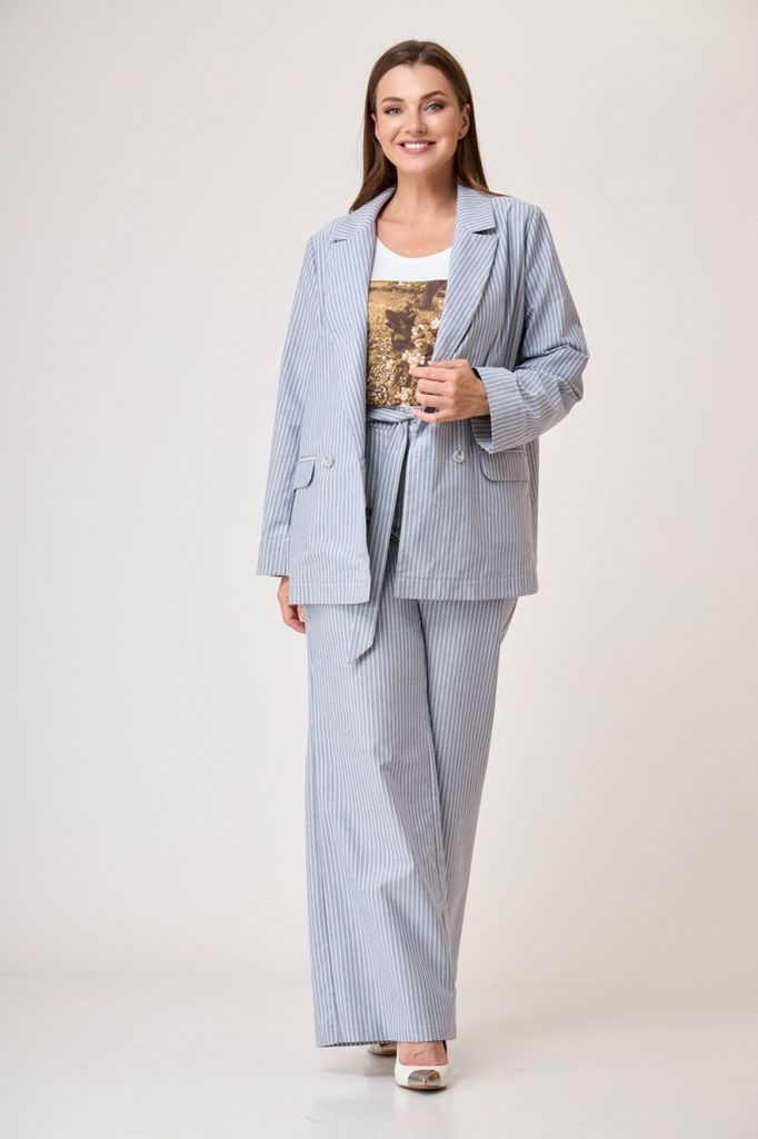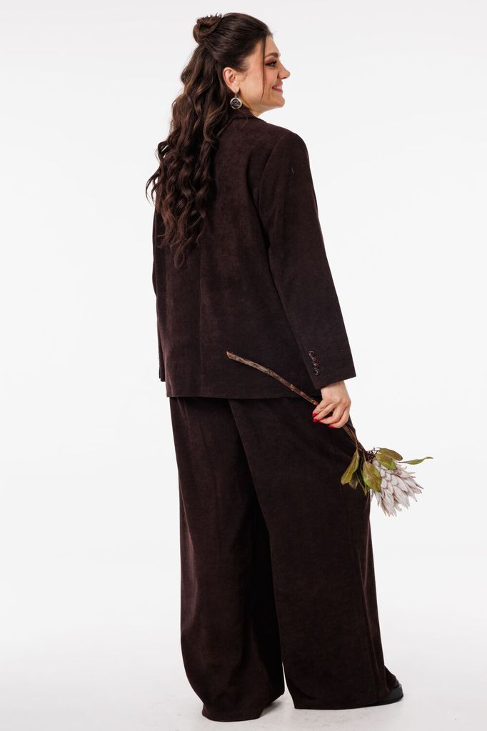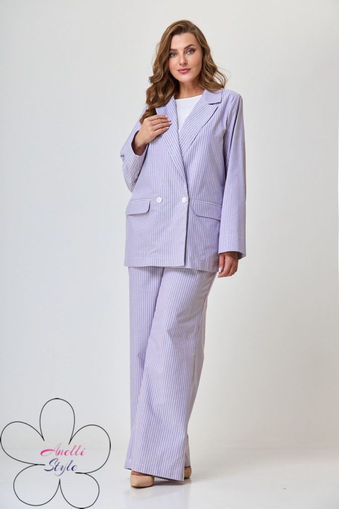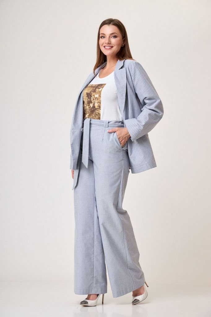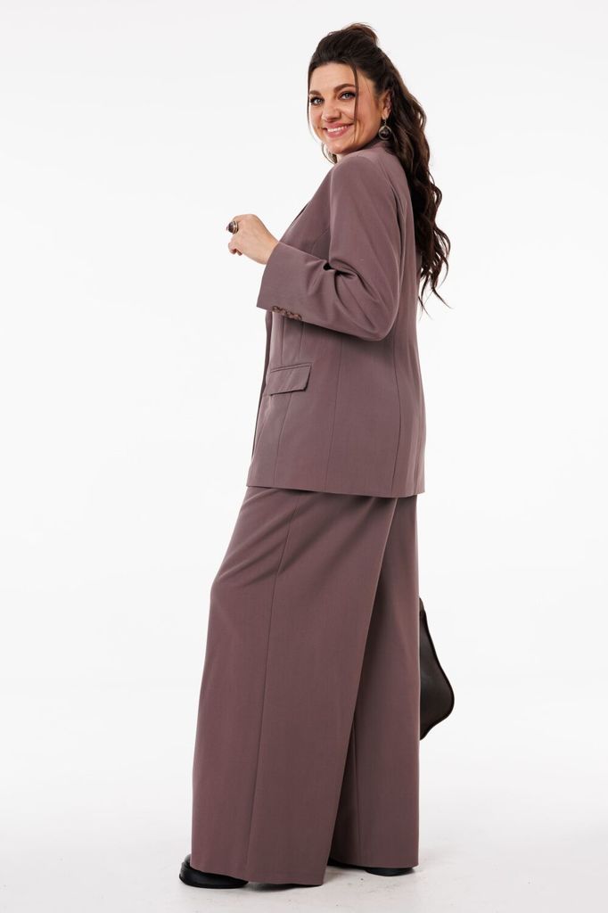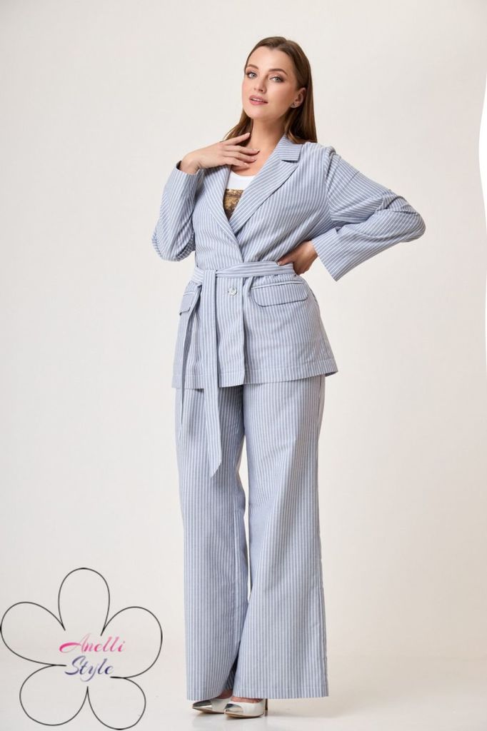 Состав: Хлопок-100%; Сезон: Осень-Зима Рост: 164 Страна бренда: Беларусь Состав: Хлопок-100%; Костюм-двойка брючный. Жакет свободного кроя, длиной до середины бедра. Рукав втачной, длинный. По переду ... Показать описаниепрорезные карманы с клапаном, двубортная застежка. Горловина обработана классическим жакетным воротником с лацканом. Брюки с высокой посадкой, длинные, расширенные к низу. По переду боковые карманы и застежка на гульфик с молнией. Пояс от бокового шва по спинке на резинке, по переду застежка на петлю пуговицу. При помощи съемного пояса можно дополнительно подчеркнуть талию, как в брюках, так и в жакете. При съемке в образе использованы изделия бренда ANELLIstyle – футболка 1015. Вся необходимая информация о производителе указана на этикетке. Цвет на фото может отличаться от цвета изделия вживую из-за разницы освещения и цветопередачи экранов, на которых просматривается изображение. Будем благодарны за ваш отзыв. Это поможет улучшить качество наших изделий. Замеры: Рост фотомодели – 171 см. Размер фотомодели – 50. ОГ-обхват груди; ОТ-обхват талии; ОБ-обхват бедер; ДИ-длина изделия. Размер 46 Жакет: ОГ-106; ОТ-108; ОБ-110; ДИ-72; ДР-62 Брюки: ОТ-76; ОБ-112; ДИ-115 (с поясом), внутренний шов – 87 Размер 48 Жакет: ОГ-110; ОТ-111; ОБ-112; ДИ-73; ДР-62 Брюки ОТ-78; ОБ-116; ДИ-116 (с поясом), внутренний шов – 86 Размер 50 Жакет: ОГ-116; ОТ-117; ОБ-118; ДИ-73; ДР-63 Брюки: ОТ-82; ОБ-118; ДИ-117 (с поясом), внутренний шов – 86 Размер 52 Жакет: ОГ-120; ОТ-121; ОБ-122; ДИ-74; ДР-62,5 Брюки: ОТ-84; ОБ-120; ДИ -116 (с поясом), внутренний шов –85 Размер 54 Жакет:ОГ-124; ОТ-125; ОБ-126; ДИ-75; ДР-63 Брюки: ОТ-86; ОБ-124; ДИ-117 (с поясом), внутренний шов – 86 Размер 56 Жакет: ОГ-128; ОТ-129; ОБ-130; ДИ-75; ДР-63 Брюки: ОТ-88; ОБ-128; ДИ -117 (с поясом), внутренний шов –86