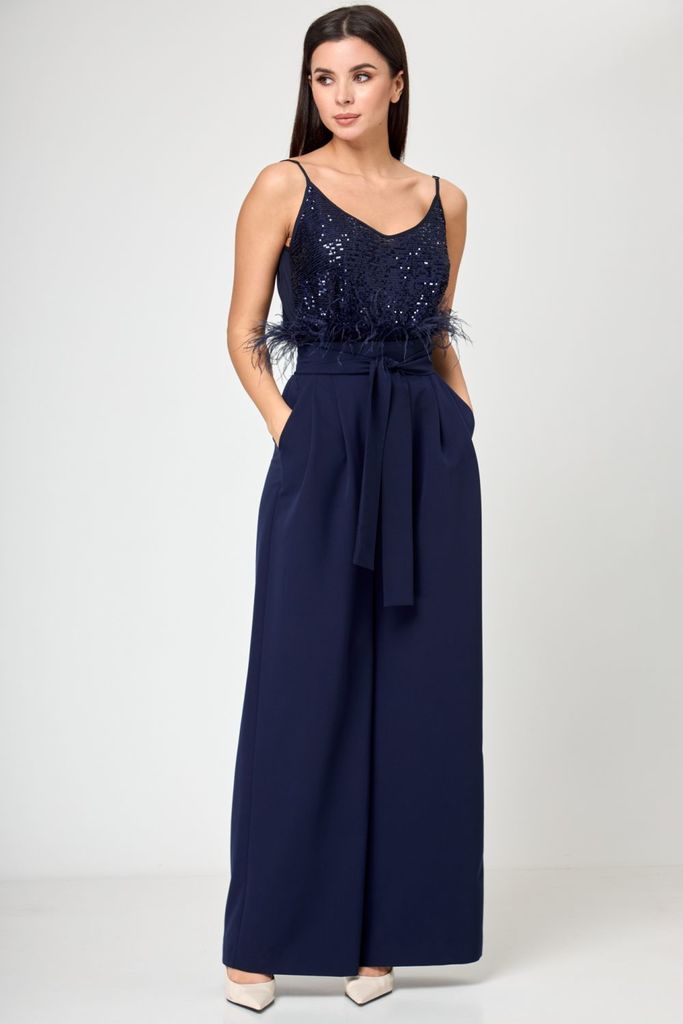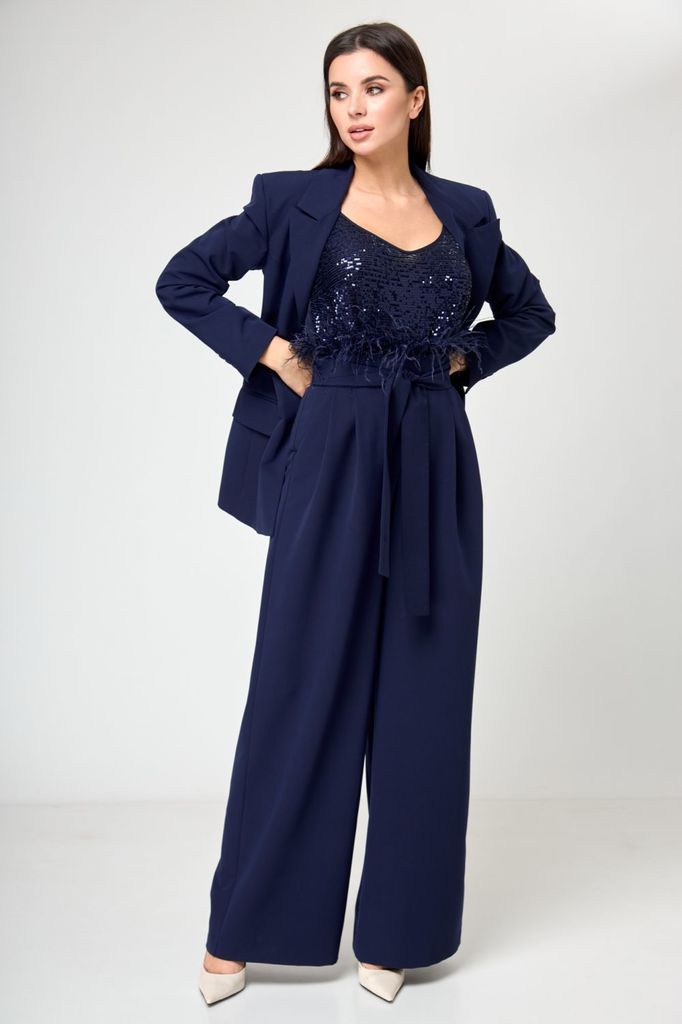 Состав: Костюм- ПЭ-96%; Спандекс-4%; Отделка- Вискоза-33%; ПЭ-64%; Спандекс-3%; Сезон: Осень-Зима Рост: 164 Страна бренда: Беларусь Состав: Костюм: ПЭ-96%; Спандекс-4%; Отделка: Вискоза-33%; ПЭ-64%; С... Показать описаниепандекс-3%; Жакет прямого, свободного силуэта, с двух-бортной застёжкой на петли и пуговицы и с внутренней застёжкой на петлю и пуговицу, перед и спинка на подкладке, по левой стороне декорирован съёмной оборкой пристёгивающаяся под лацканом на пришивные кнопки. Перед с прорезными карманами с листочкой и клапаном. Рукава втачные, двушовные, длинные, понизу с разрезом в локтевом шве и притачными манжетами застёгивающиеся на навесную петлю и пуговицу. Воротник пиджачного типа. Брюки широкие, свободного прямого силуэта, на притачном поясе. Застёжка на тесьму-молнию в среднем шве переда и петлю и пуговицу по поясу. Передние части с талевой выточкой и косыми боковыми карманами. Задние части с талевой выточкой.